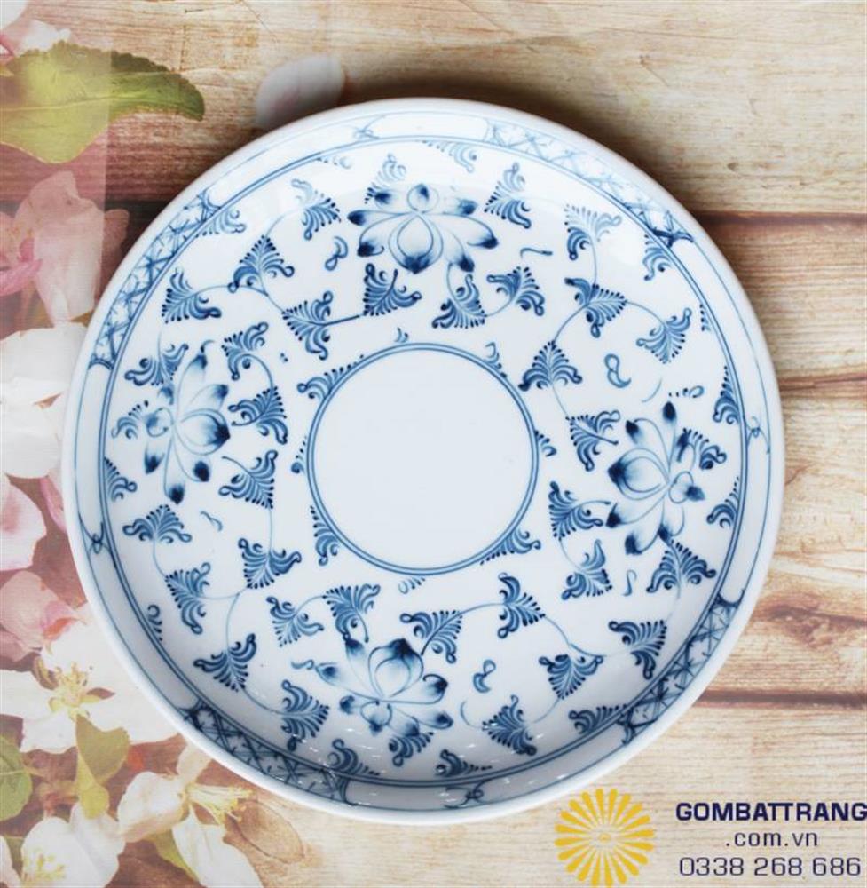 Thiết kế đĩa bản rộng, lý tưởng để bày các món chính như thịt gà, giò chả hoặc rau củ luộc, làm nổi bật sắc xanh của hoa văn men lam.