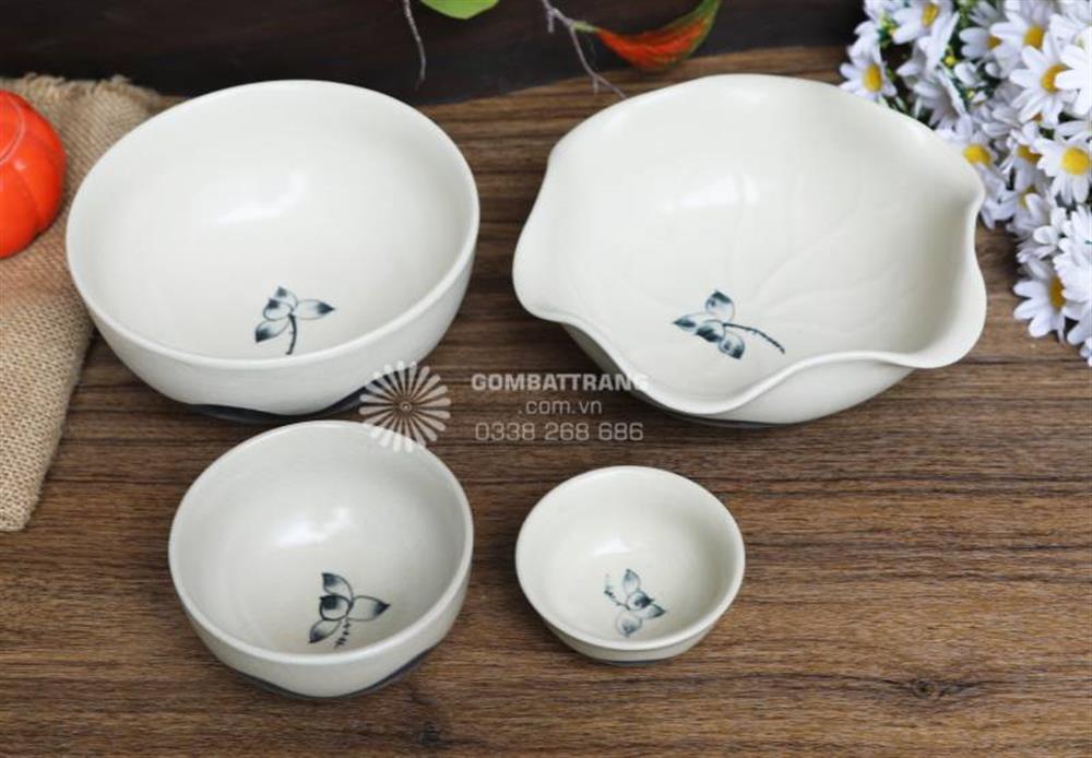 Ở lòng bát và đĩa, một cụm họa tiết hoa sen nhỏ được đặt ở vị trí trung tâm với nét vẽ tối giản, giúp sản phẩm không bị trống trải khi sử dụng. Phần viền bát đĩa được vẽ theo độ gợn tự nhiên của miệng gốm, kết hợp những chấm mực li ti tạo cảm giác sinh động, tăng tính tự nhiên và sự đồng điệu giữa hình dáng và họa tiết.