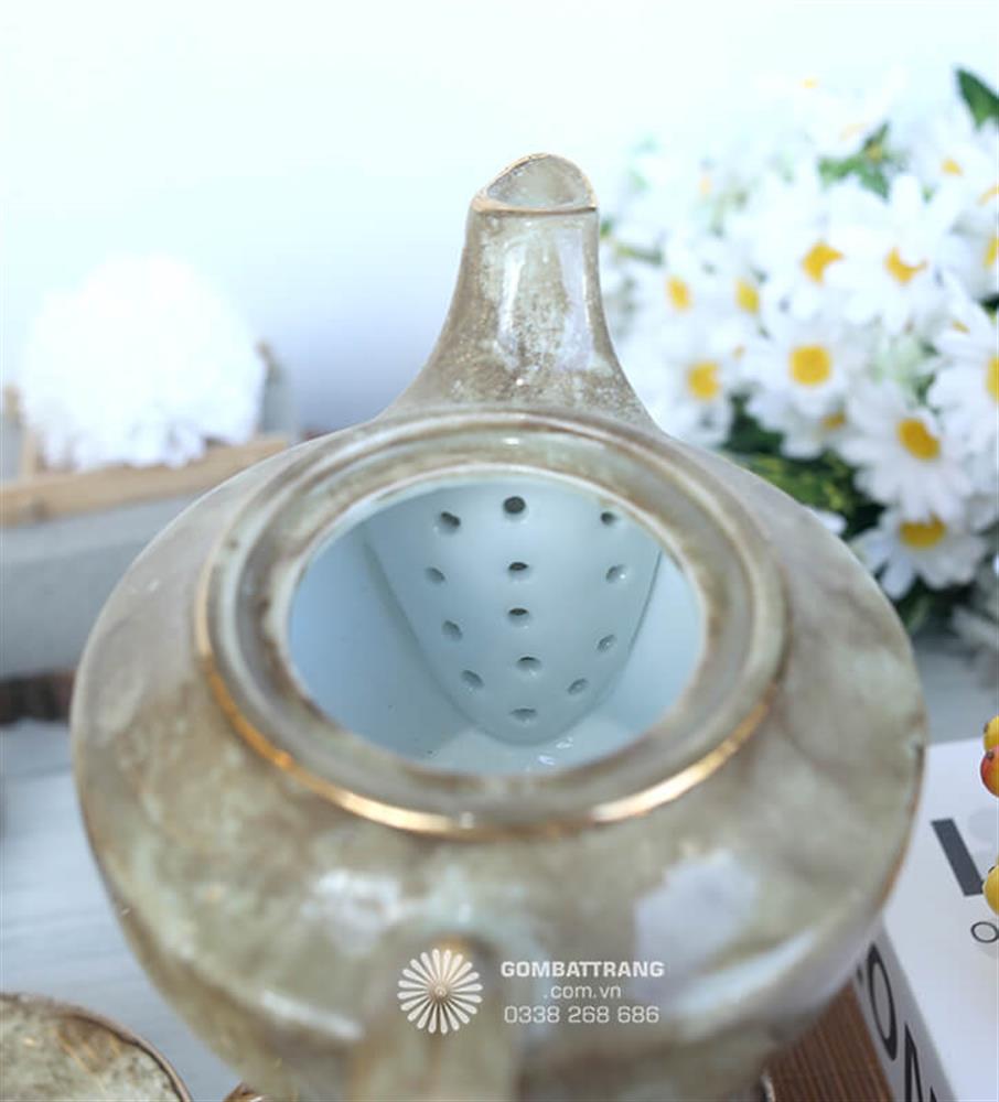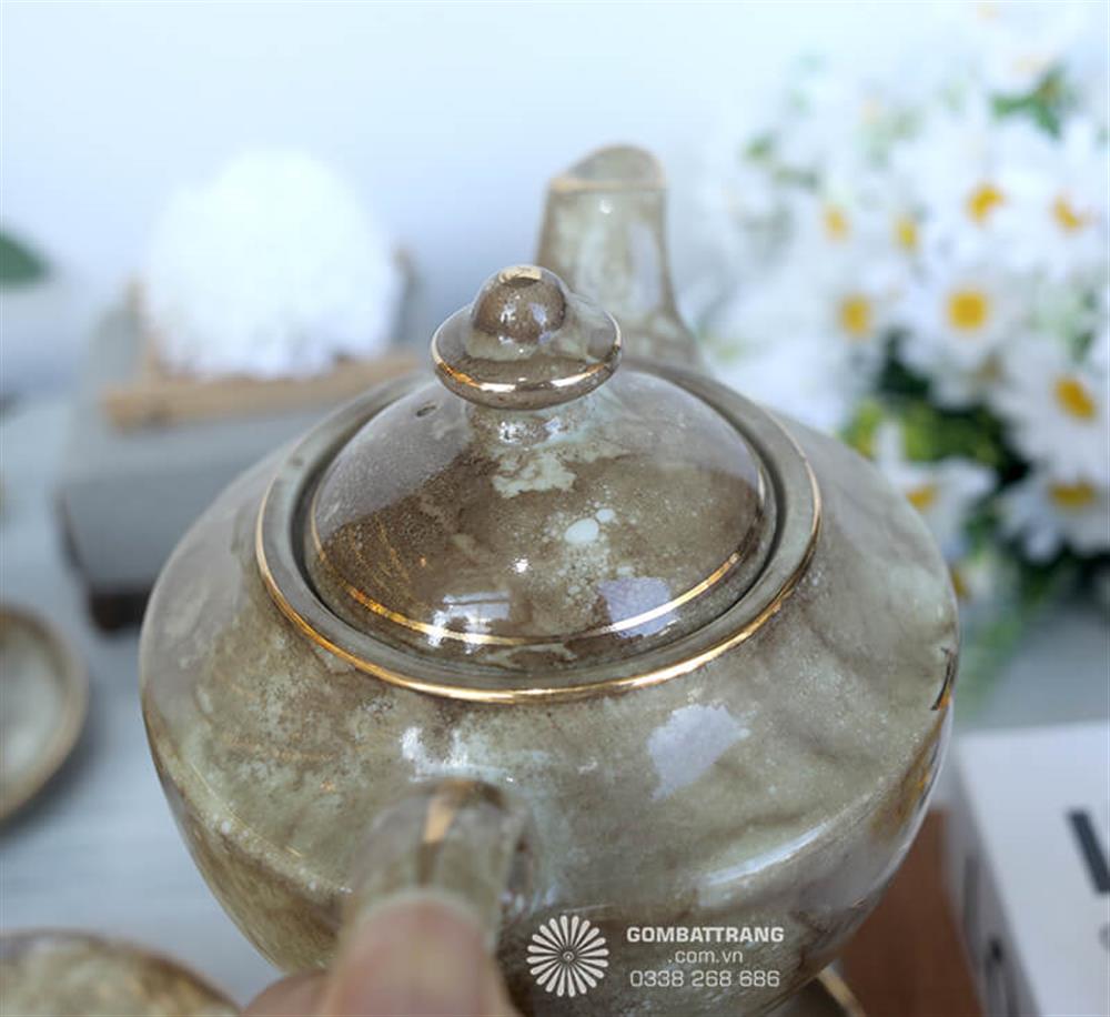 Men hỏa biến nâu nhạt trên bộ bình trà Bát Tràng giúp tạo chiều sâu cho sản phẩm, đồng thời dễ dàng vệ sinh và bền màu theo thời gian. Sự kết hợp giữa màu men và họa tiết vàng mang lại vẻ đẹp độc đáo khó nhầm lẫn với các mẫu ấm chén Bát Tràng giá rẻ thông thường.Bộ bình trà Bát Tràng