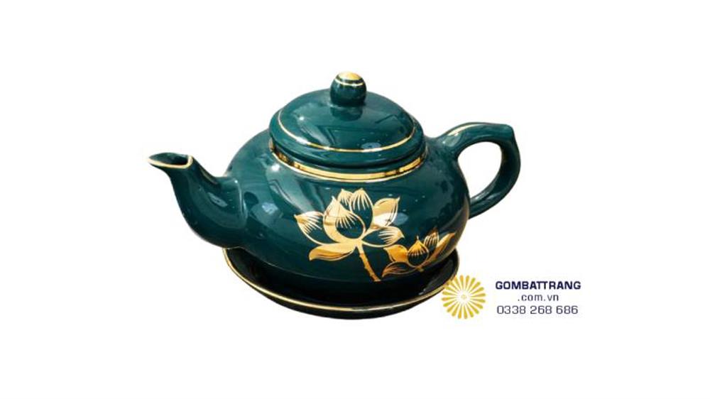 Bộ ấm chén Hồng Xanh Cửu Long – men xanh lục sâu bóng loáng, họa tiết sen vàng tinh xảo.