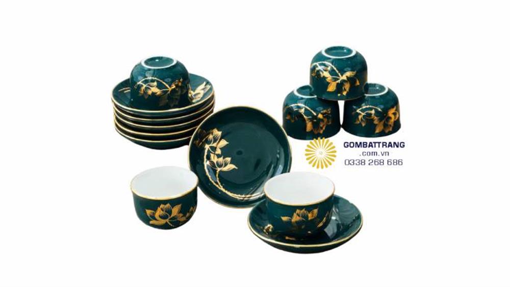 Bộ chén đẹp gốm Bát Tràng Sen Vàng Kim cát tường