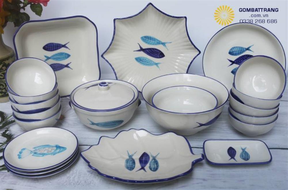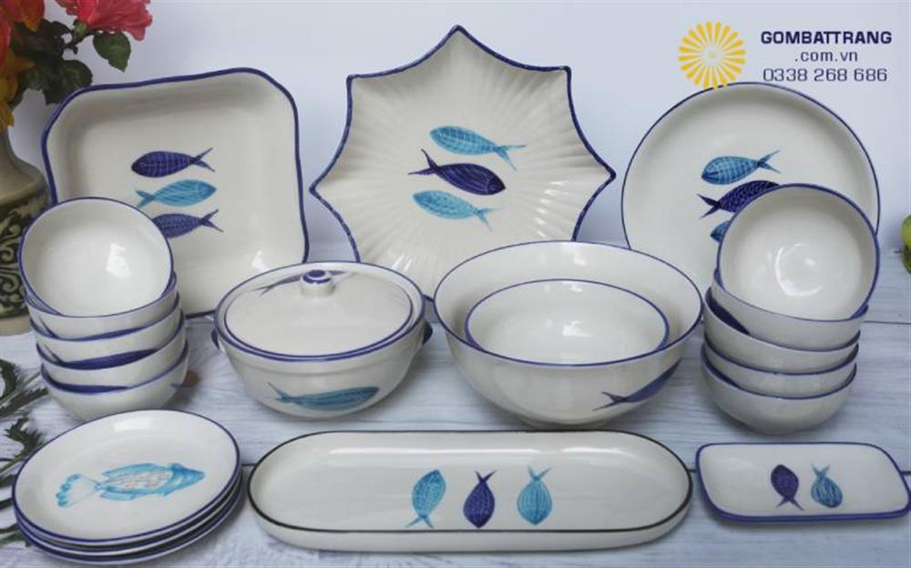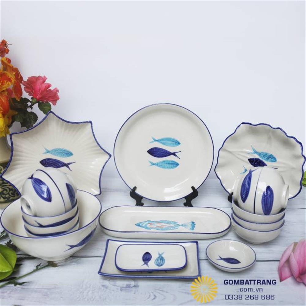 Bộ chén dĩa gốm Bát Tràng đầy đủ chi tiết, men trắng ngà viền xanh lam, họa tiết cá xanh sang trọng