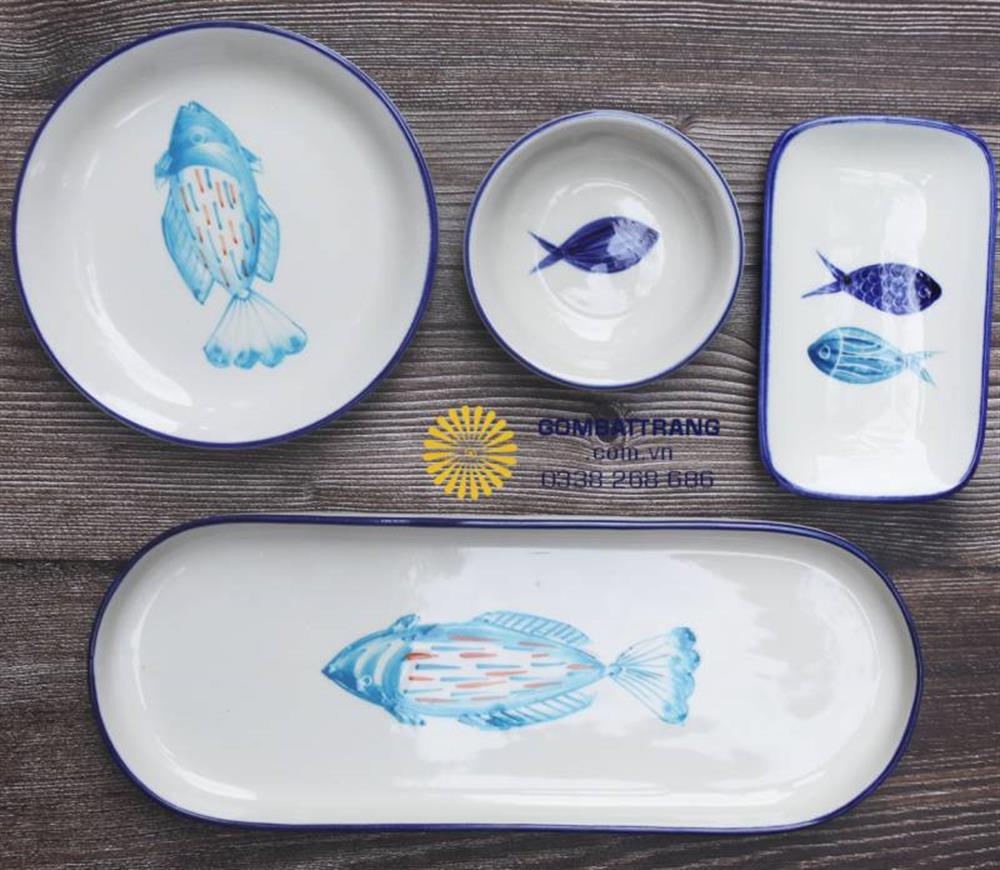 Đĩa chữ nhật: dáng dài thanh thoát, bày nem rán hoặc sushi, kết hợp họa tiết cá uyển chuyển khiến món ăn thêm tinh tế. Bộ chén dĩa gốm Bát Tràng