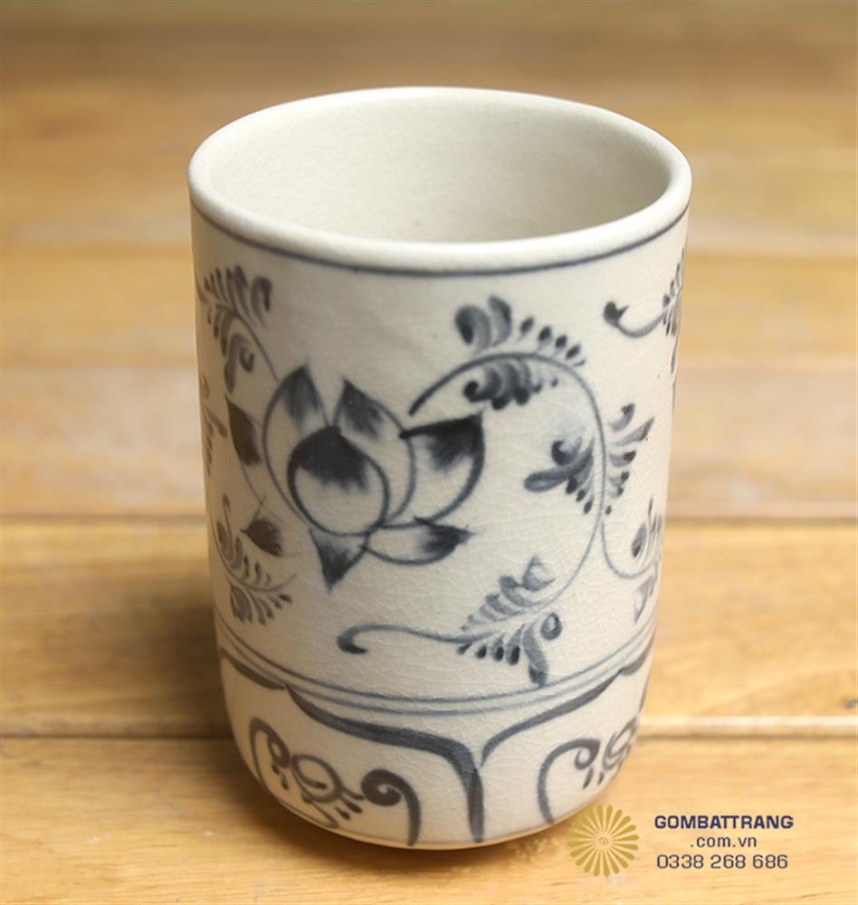 Chiếc ly trụ cao thẳng đứng trong bộ chén dĩa cổ rõ nét với thân tròn đều, miệng thẳng và nền men trắng ngà điểm họa tiết hoa sen nở rộ. Ly có thể dùng đựng trà, nước hoặc làm bút đựng bàn làm việc, phù hợp với nhiều không gian sử dụng khác nhau.bộ chén dĩa gốm Bát Tràng