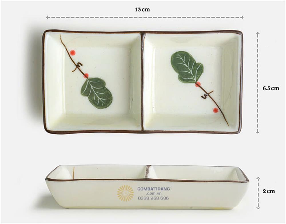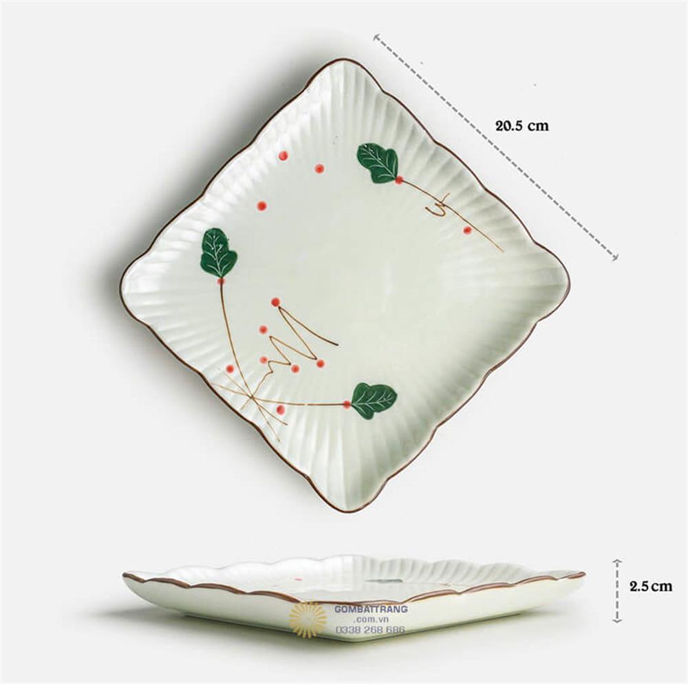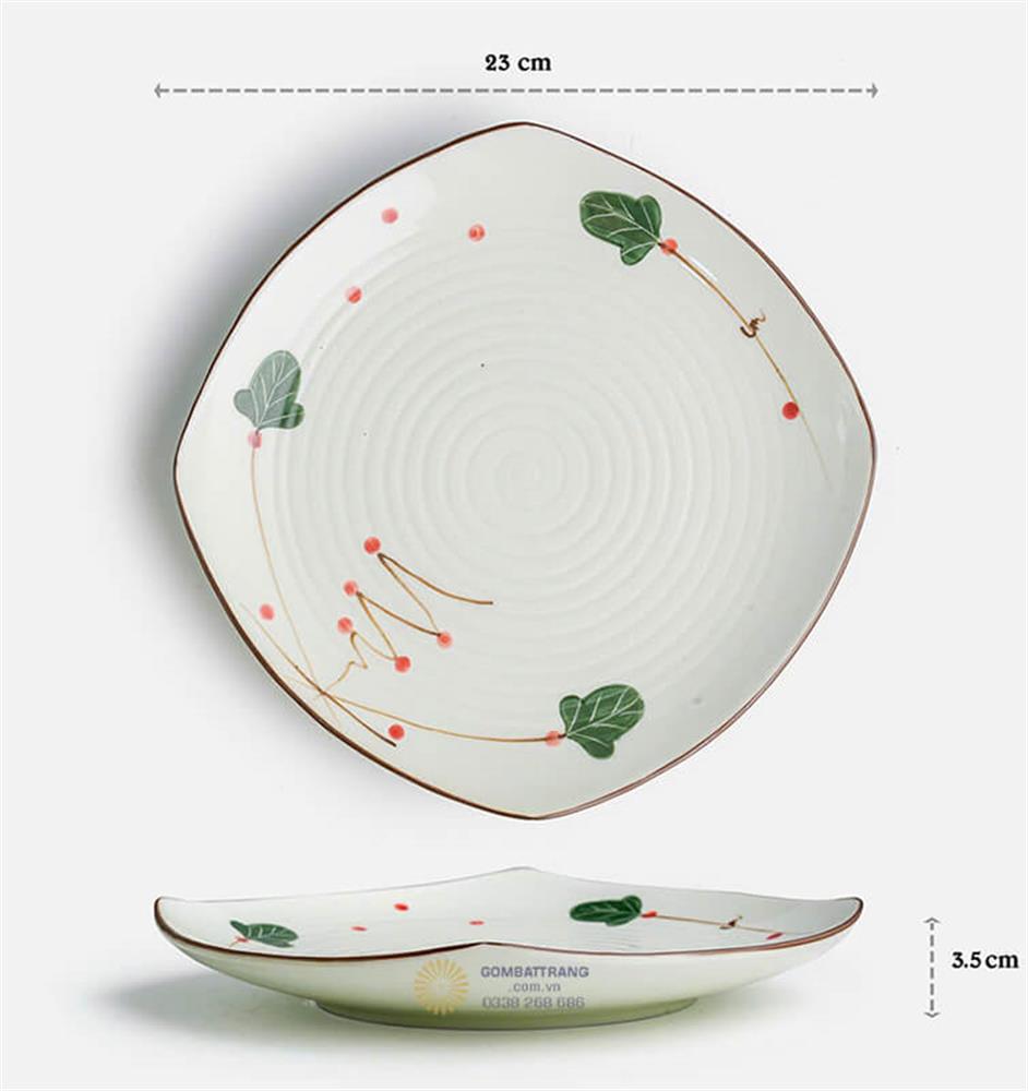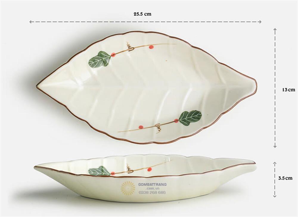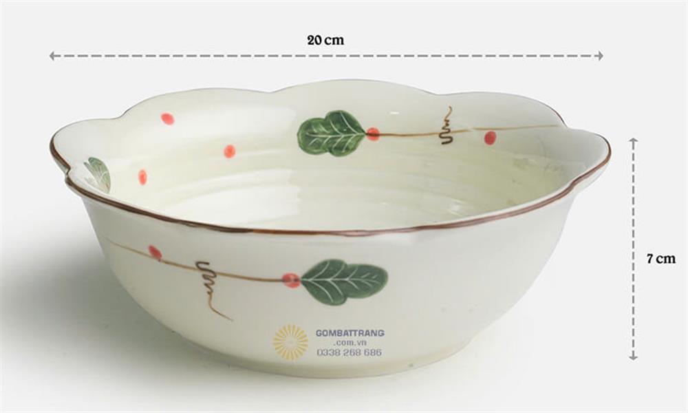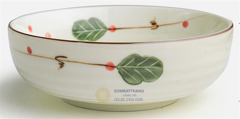 Những chiếc lá xương rồng xanh mướt được vẽ tay tinh xảo, kết hợp cùng những chấm đỏ nhỏ li ti tạo nên điểm nhấn sinh động trên bề mặt sứ trắng ngà. Đây là bát đĩa gốm sứ bát tràng cao cấp với đường viền sang trọng chạy quanh mép, tăng thêm vẻ sang trọng cho từng món đồ.