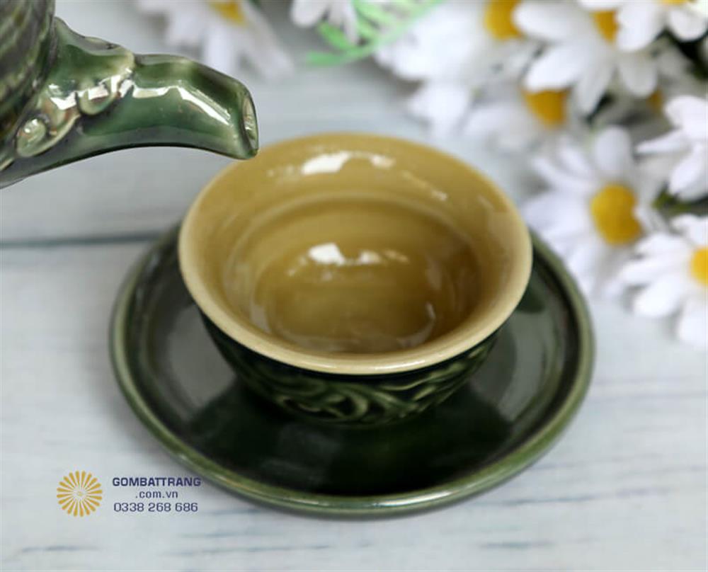 Chất liệu gốm sứ cao cấp của bộ ấm chén pha trà đạo có khả năng giữ nhiệt tốt, giữ nguyên hương vị trà trong thời gian dài. Bề mặt men láng mịn màu xanh lá ấn tượng tạo cảm giác thư thái, gần gũi với thiên nhiên khi thưởng trà. Mỗi chén trà có phần thân bên ngoài màu xanh lá đậm với họa tiết hoa sen nổi tinh xảo, bên trong được tráng men màu vàng nhạt ấm áp.bộ chén uống trà đẹp