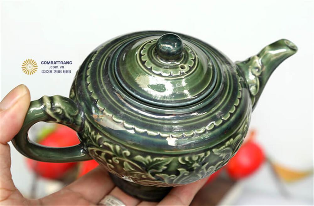 Bộ chén uống trà đẹp bao gồm ấm trà chính có dung tích lớn với thiết kế dáng tròn đầy, thanh lịch và sang trọng. Màu sắc xanh lá cổ điển kết hợp với họa tiết hoa sen nổi được chạm khắc tỉ mỉ bao quanh thân ấm tạo nên vẻ đẹp nghệ thuật độc đáo. Nắp ấm được thiết kế chắc chắn với họa tiết hoa văn cầu kỳ, tay cầm ấm cong mềm mại giúp người dùng dễ dàng rót trà.bộ chén uống trà đẹp