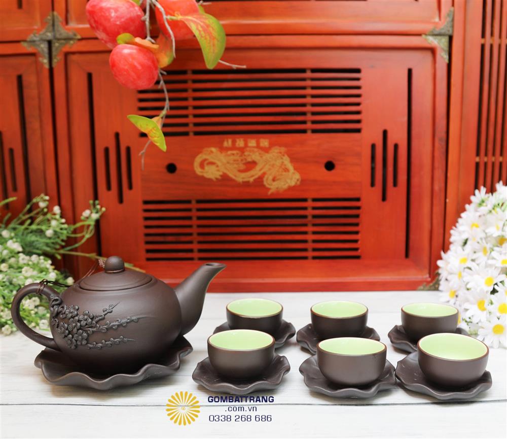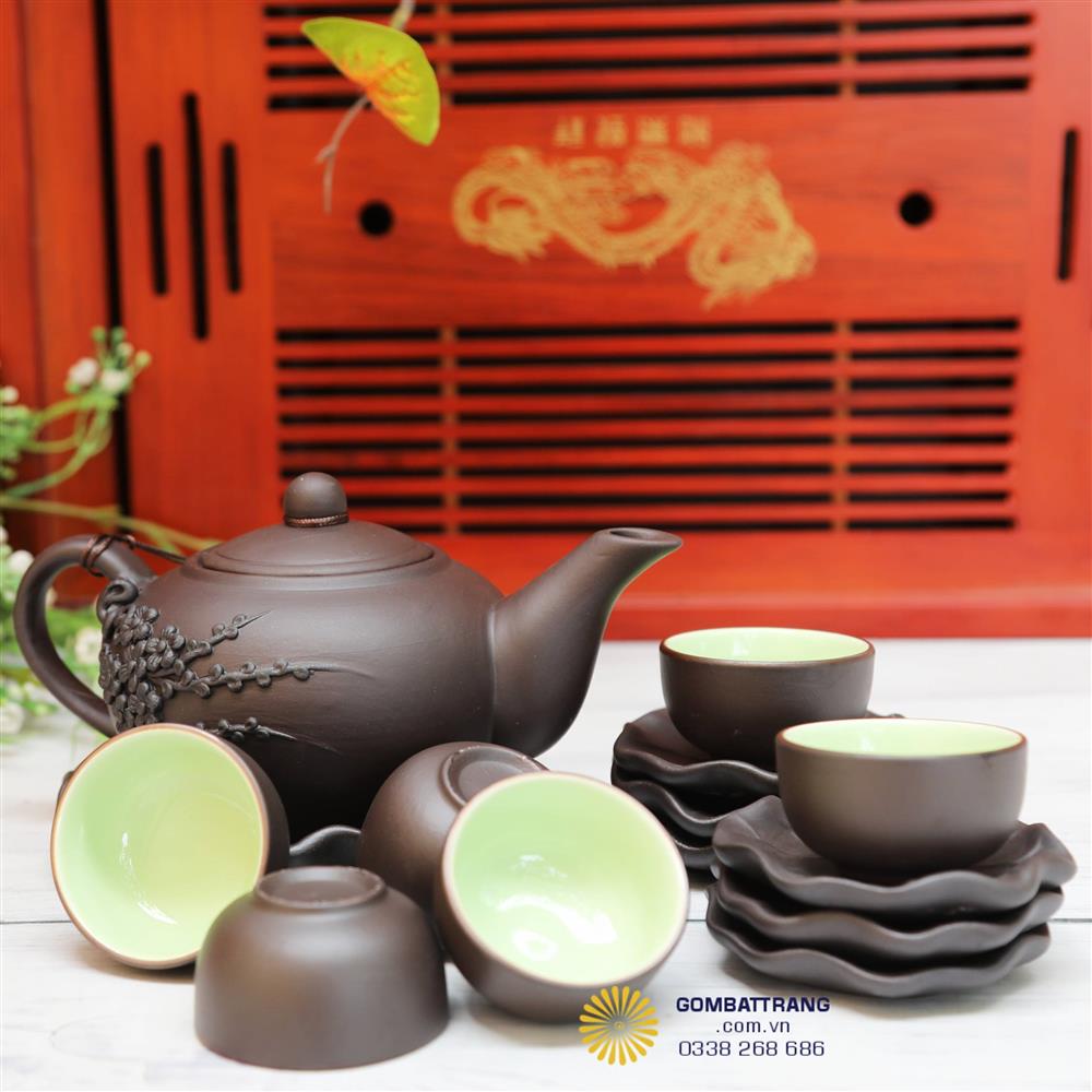 Toàn cảnh bộ ấm chén hoa mai Bát Tràng được sắp đặt tinh tế, thể hiện trọn vẹn vẻ đẹp mộc mạc mà trang nhã. Tông nâu trầm đặc trưng của đất gốm hòa cùng men ngọc sáng, tạo nên tổng thể hài hòa, sang trọng và gần gũi.
