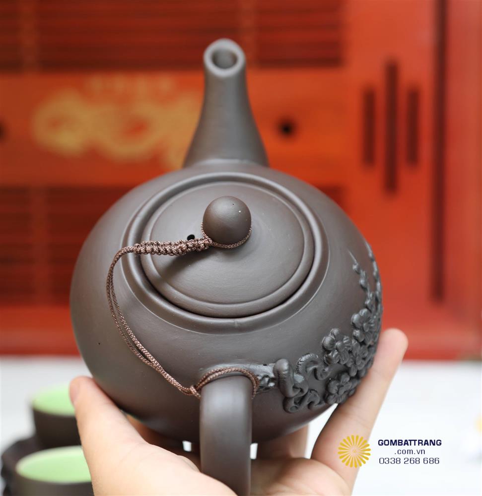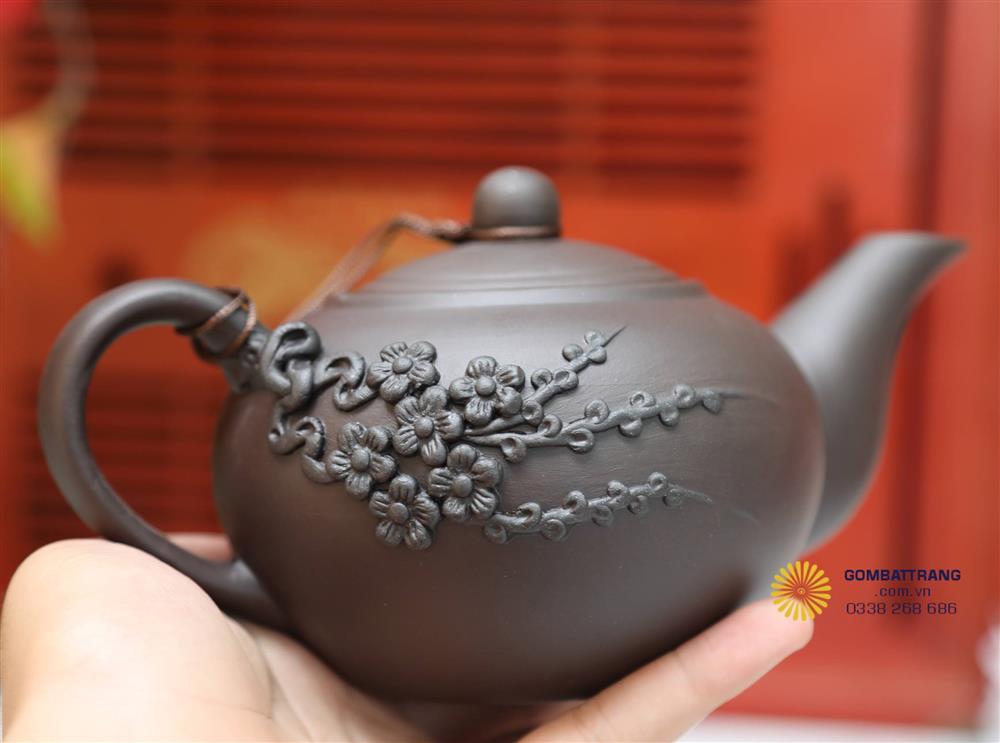 Cận cảnh họa tiết hoa mai khắc nổi trên thân ấm – từng cánh hoa được nắn thủ công tỉ mỉ, tạo nên chiều sâu và điểm nhấn độc đáo cho toàn bộ thiết kế. Đó là sự giao thoa giữa nghệ thuật điêu khắc và kỹ thuật nung truyền thống.