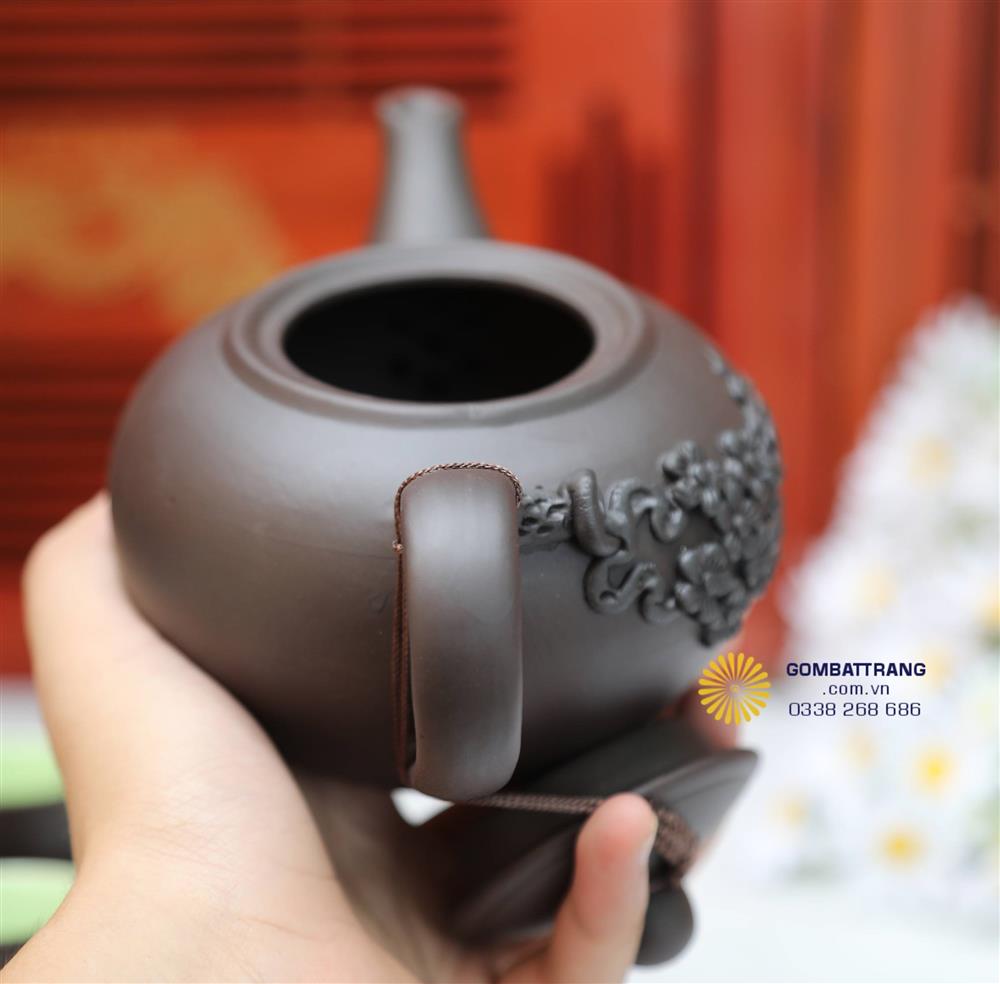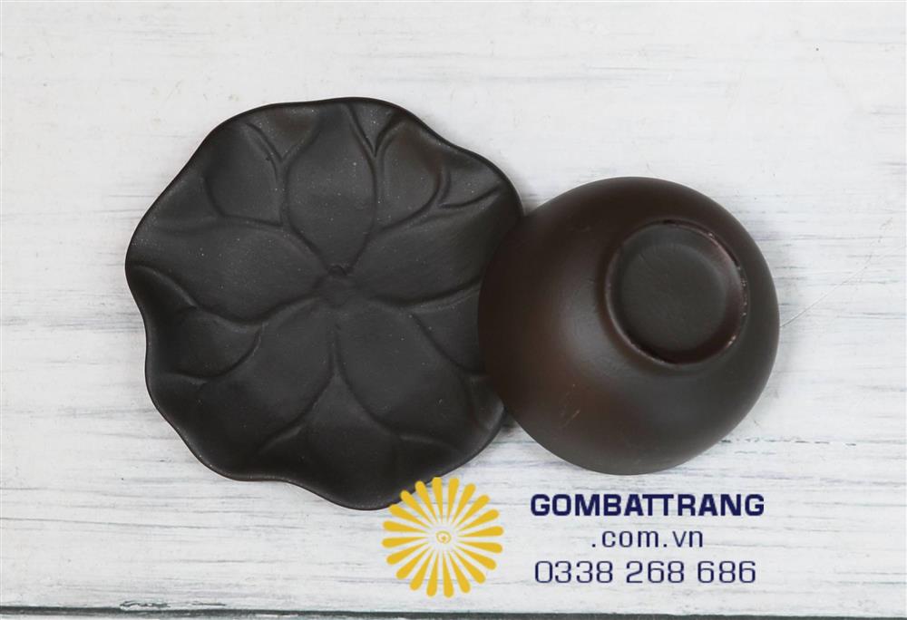 Chiếc ấm được đặt trên đĩa sen thủ công, tượng trưng cho sự tinh khiết và thanh cao. Bề mặt gốm nhám nhẹ, cầm chắc tay, mang đến cảm giác gần gũi mà vẫn giữ nét trang nhã cho không gian thưởng trà.