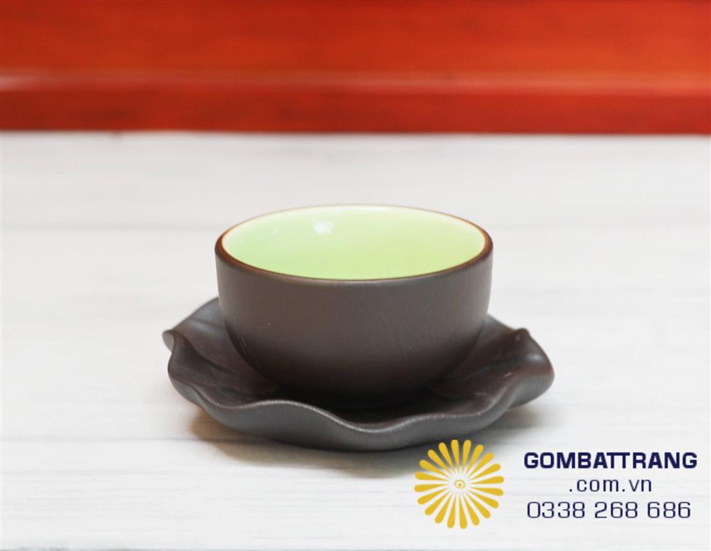 Chén trà nhỏ men ngọc sáng nhẹ, nổi bật trên nền đĩa nâu trầm. Lớp men được phủ đều, bóng nhẹ, tôn lên sắc nước trà trong mỗi lần thưởng thức, đồng thời giữ nhiệt tốt và an toàn cho sức khỏe.