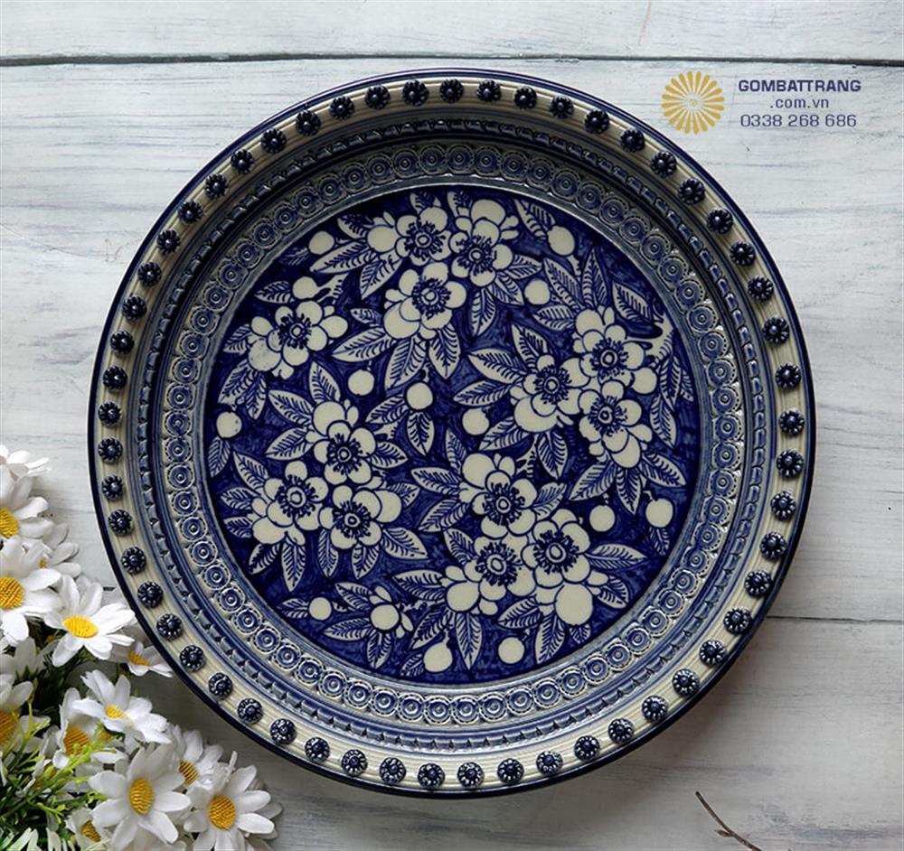 Bộ uống trà bát tràng được hoàn thiện bởi chiếc đĩa lót tròn lớn với đường kính rộng, đủ không gian để sắp xếp trọn bộ ấm chén một cách hài hòa. Đĩa lót cũng được trang trí họa tiết hoa đào xanh lam đồng bộ với ấm và chén, tạo nên tổng thể thẩm mỹ hoàn hảo. Thiết kế đĩa có viền nổi tinh tế, bề mặt phẳng mịn giúp đặt các phụ kiện chắc chắn.bộ uống trà bát tràng