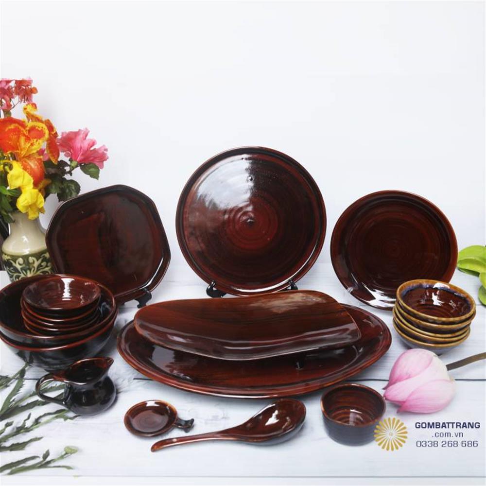 Bộ bát đĩa Bát Tràng men nâu đỏ trầm ấm, kết hợp đĩa tròn, vuông và tô lớn, mang đậm phong cách giả cổ tinh tế.
