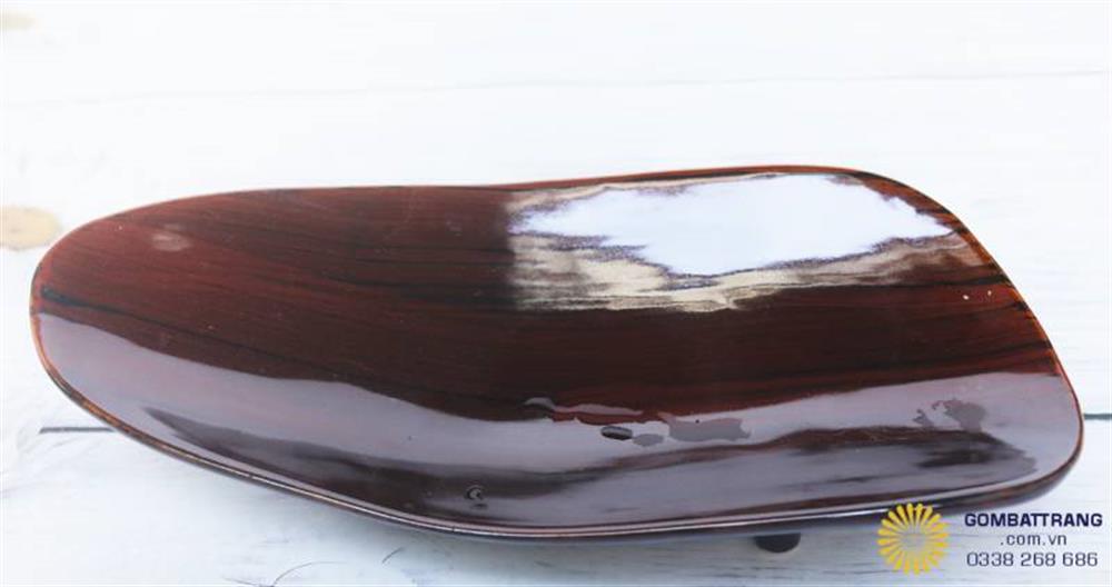 Đĩa thuyền gốm sứ Bát Tràng giả cổ, dáng dài uốn cong mềm mại, sắc men nâu đỏ lấp lánh dưới ánh sáng.