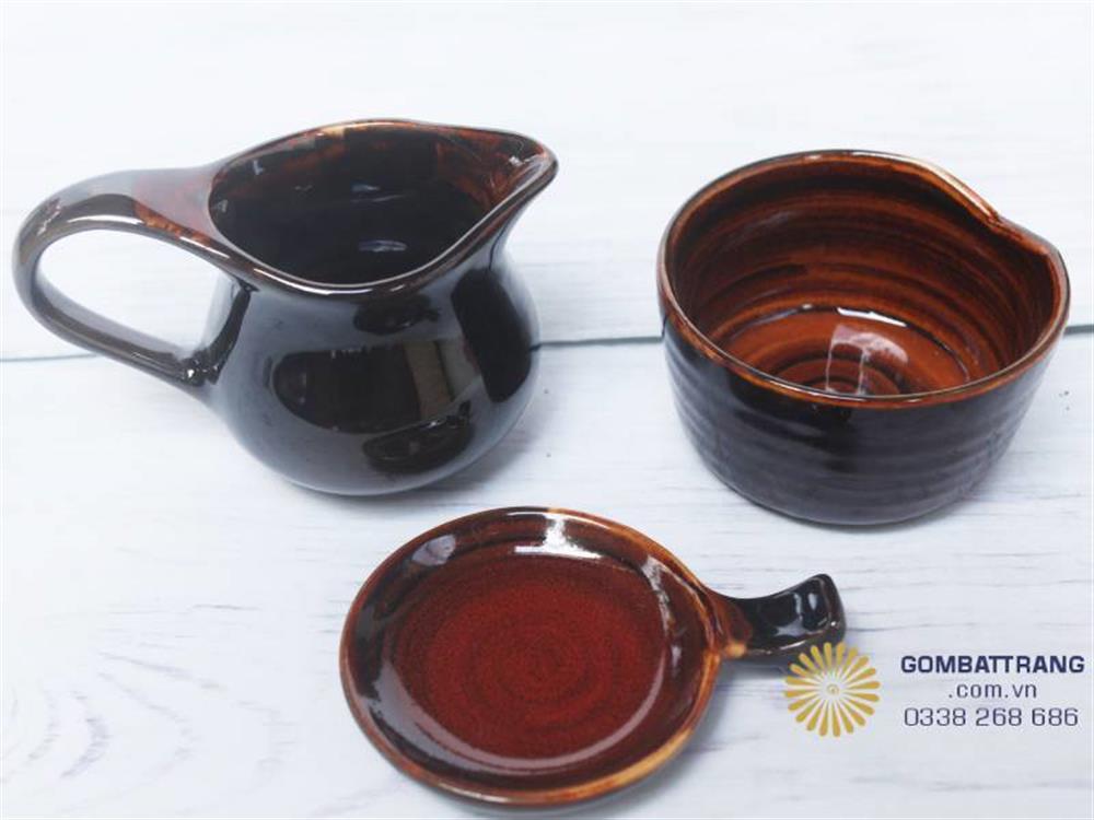 Bộ phụ kiện gốm Bát Tràng men nâu, gồm ly, bát nhỏ và đĩa kê, kiểu dáng gọn gàng, tinh xảo trong từng chi tiết.