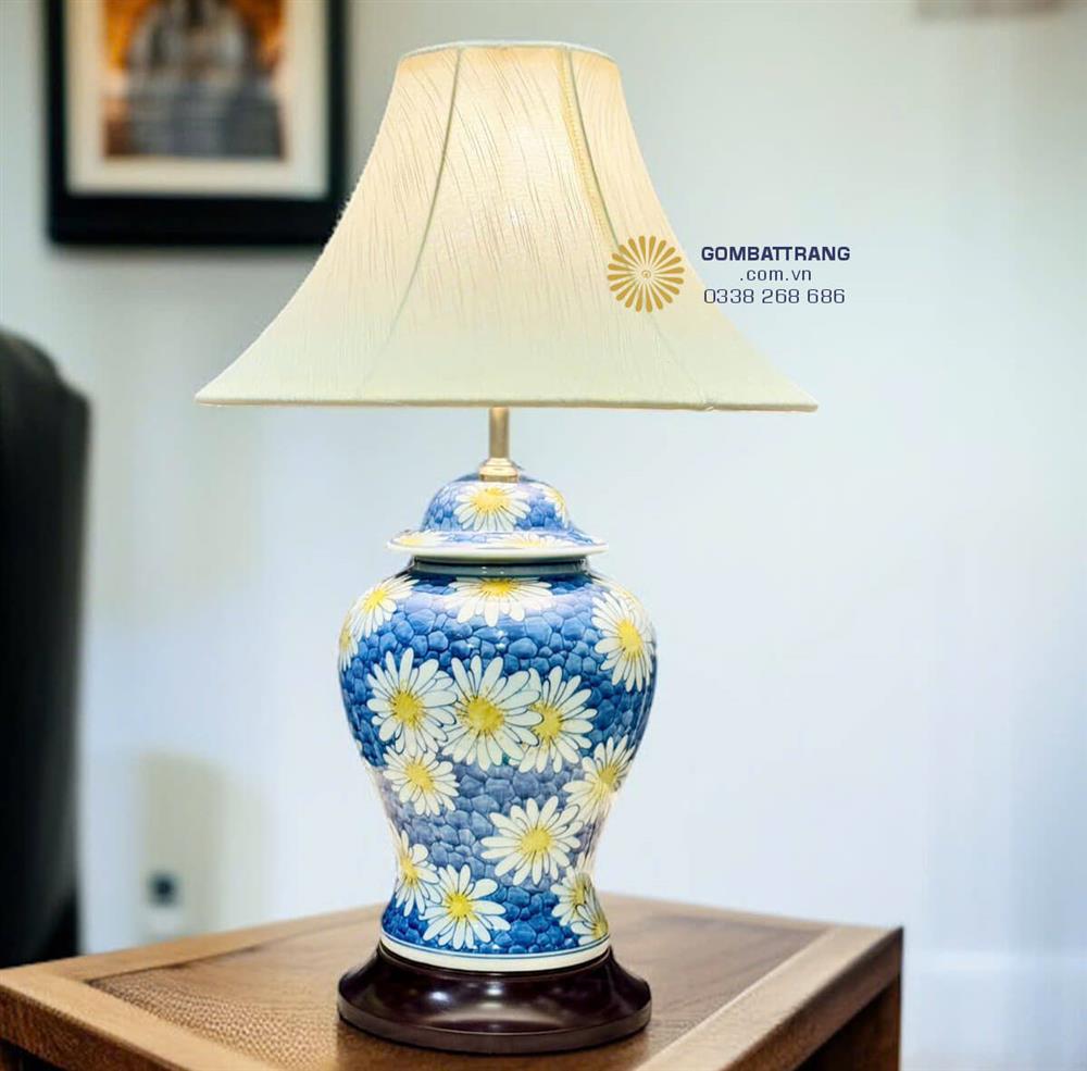 Đèn bàn trang trí phòng ngủ gốm sứ vẽ hoa cúc tinh tế, ánh sáng dịu nhẹ cho giấc ngủ sâu.