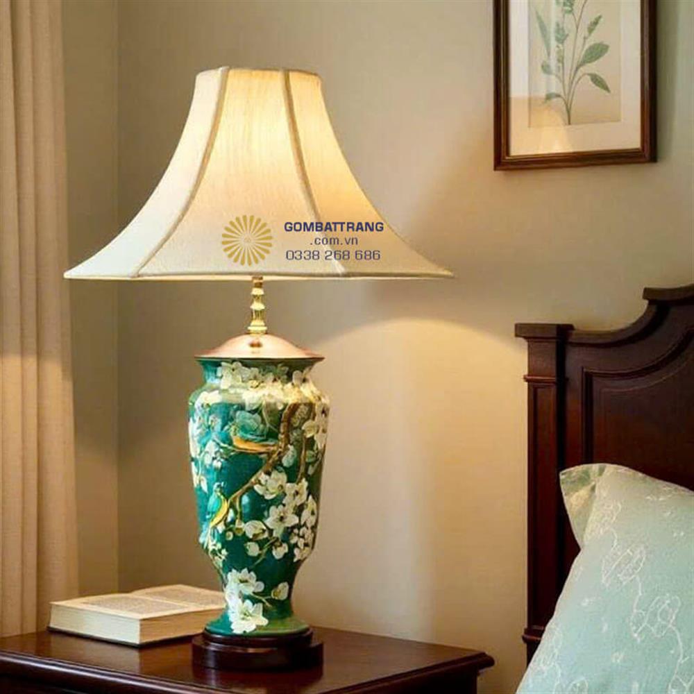 Đèn ngủ gốm – Men xanh lục bảo vẽ hoa Mộc Lan sang trọng