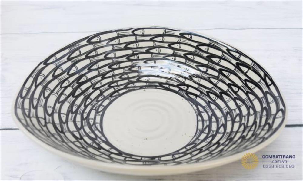 Đĩa tròn lòng rộng, viền họa tiết cá nối tiếp, lý tưởng để bày các món chính như gỏi, cá nướng hoặc hải sản.