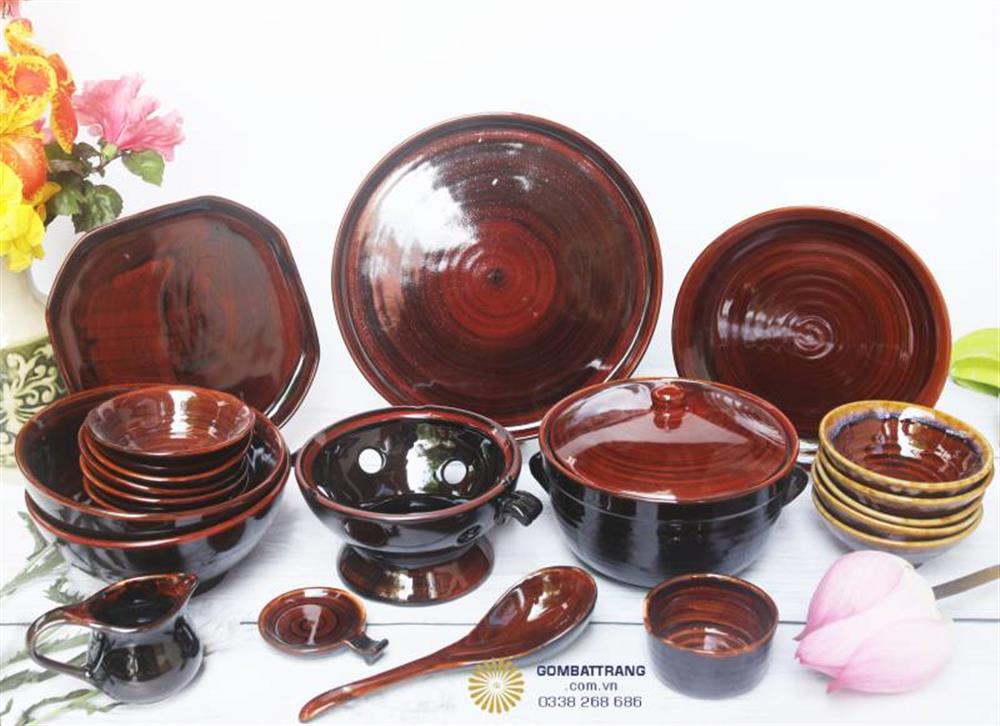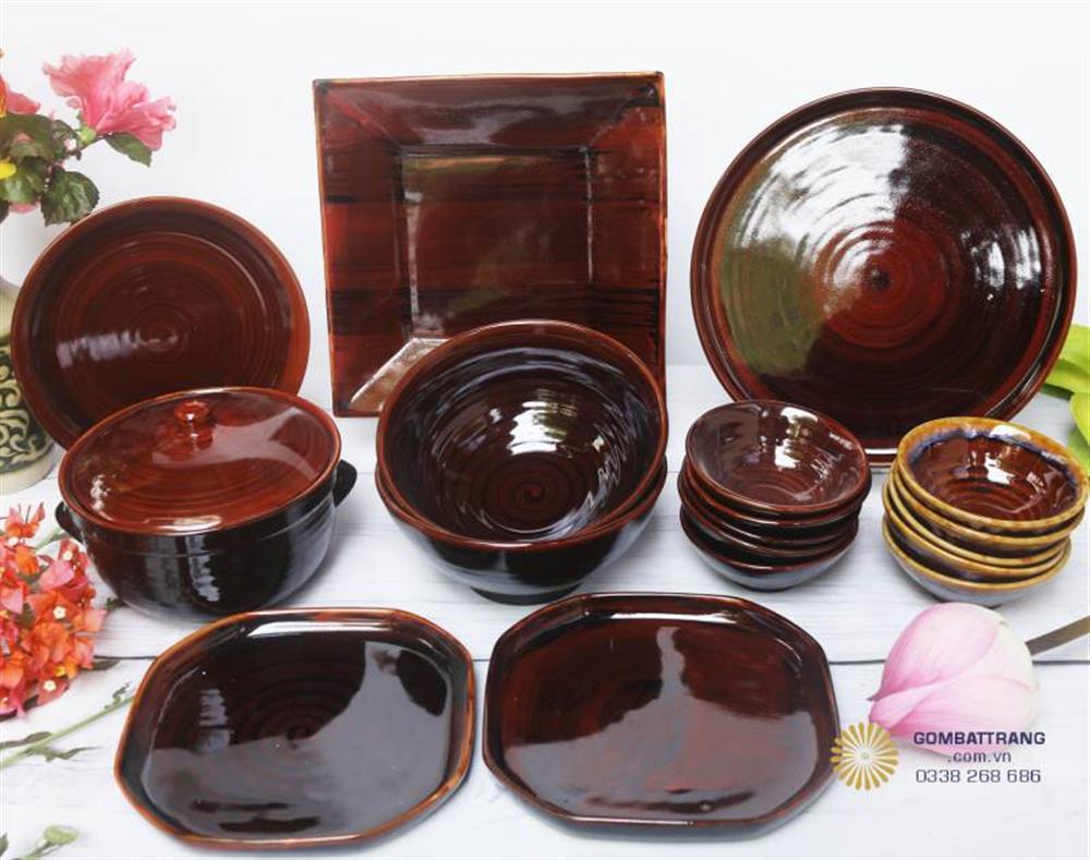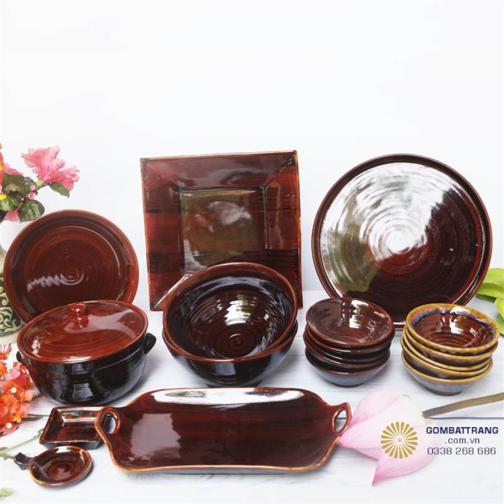 Bộ bát đĩa men nâu đỏ ánh gương, hơn 15 chi tiết kết hợp hài hòa, như một bức tranh cổ điển bày giữa gian bếp Việt.