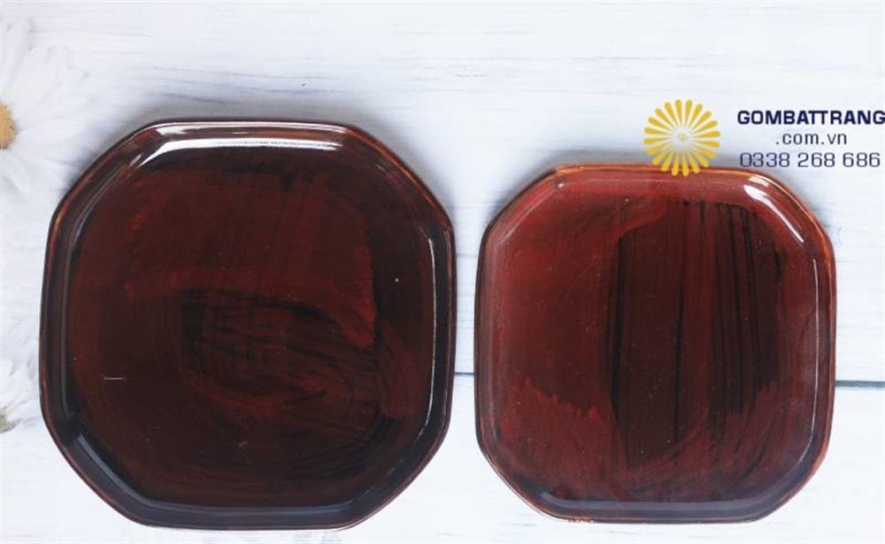 Hai chiếc đĩa vuông giả cổ, sắc men nâu ánh đen đồng nhất, đường viền mượt mà như được khắc họa bằng nét bút mực tàu.