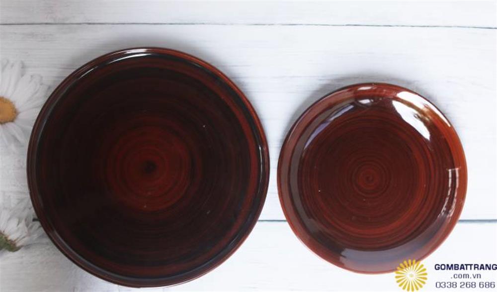 Đĩa tròn đồng tâm, men đỏ ánh nâu, đường xoáy gợi hình vũ trụ – vòng tròn của sự viên mãn, thu hút ánh nhìn ngay lần đầu.