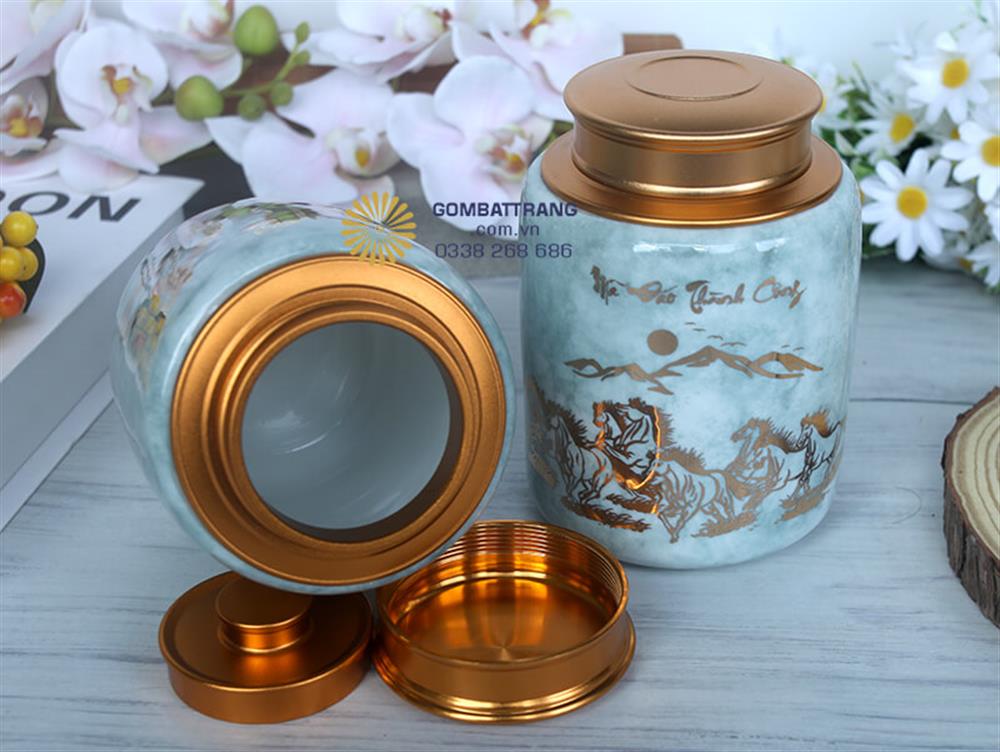 Những chiếc hộp trà gốm cao cấp với họa tiết phong thủy mạ vàng đang trở thành xu hướng được nhiều người yêu thích, mang đến sự kết hợp hoàn hảo giữa công năng sử dụng và giá trị tâm linh. Bộ sưu tập lọ đựng chè đẹp họa tiết vàng kim cổ điển không chỉ giúp bảo quản hương vị chè nguyên vẹn mà còn là điểm nhấn sang trọng cho mọi không gian.hộp đựng chè bằng sứ