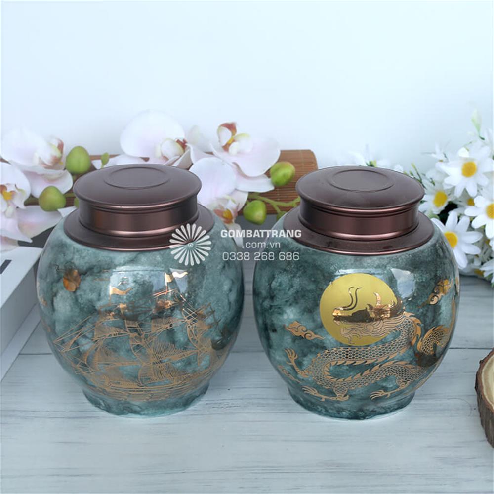 Lọ đựng chè Bát Tràng mang họa tiết rồng uốn lượn quanh thân lọ, được vẽ bằng kỹ thuật chấm vàng kim tinh xảo