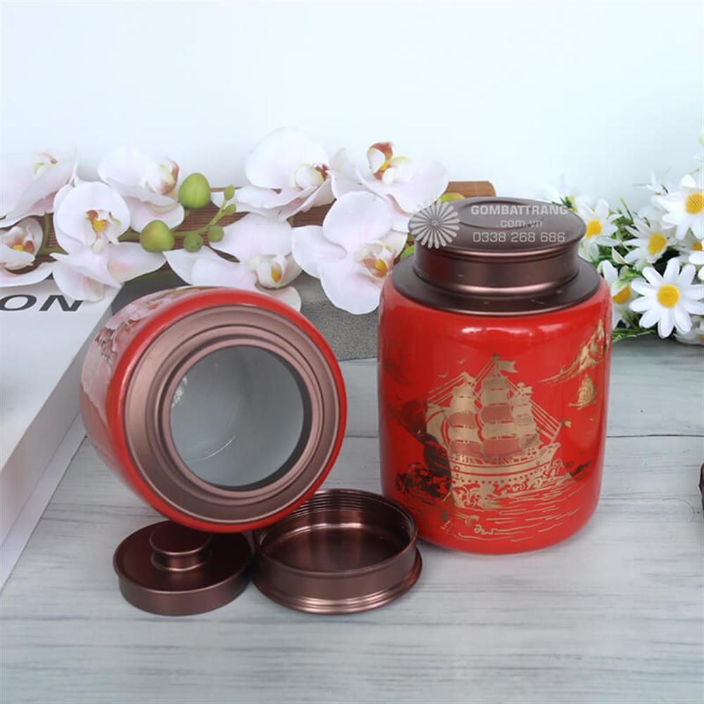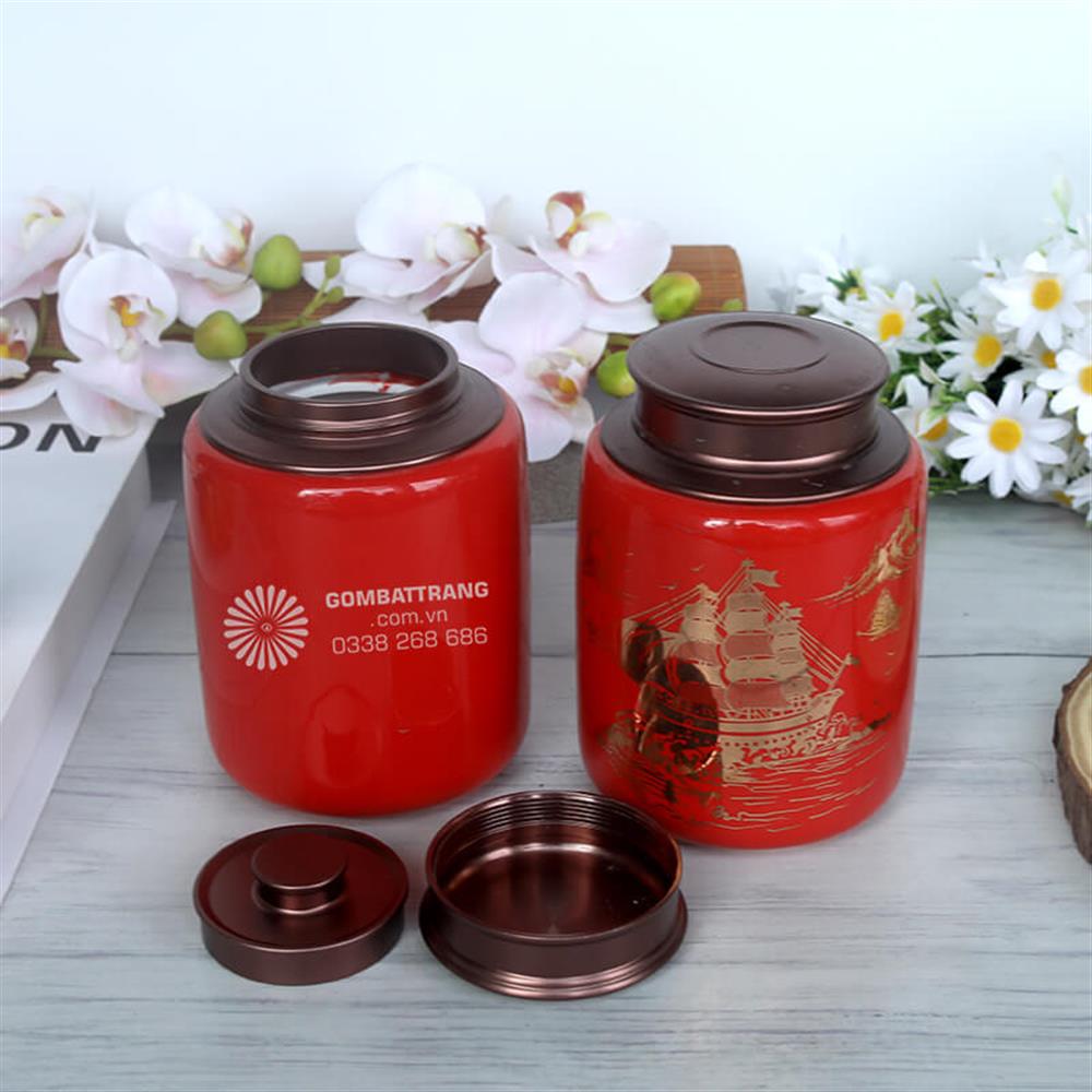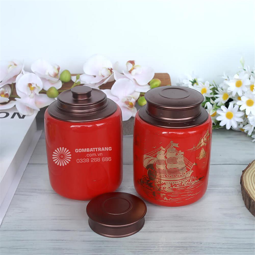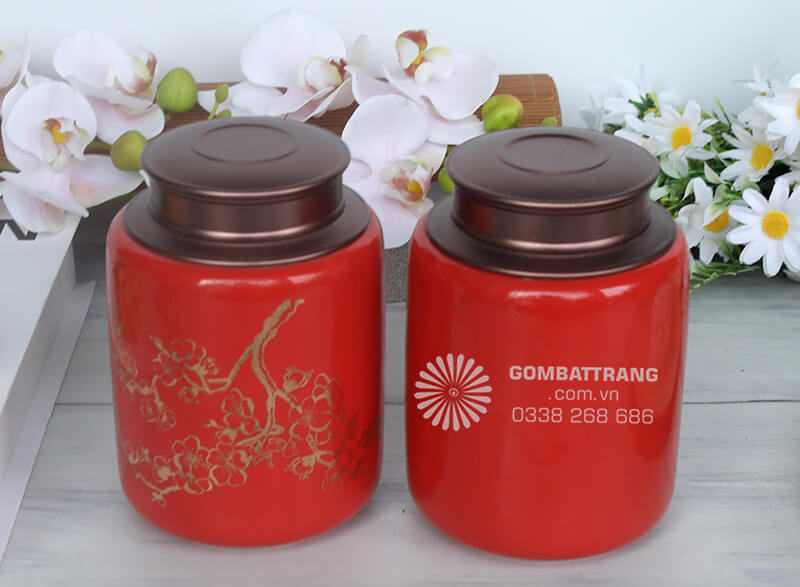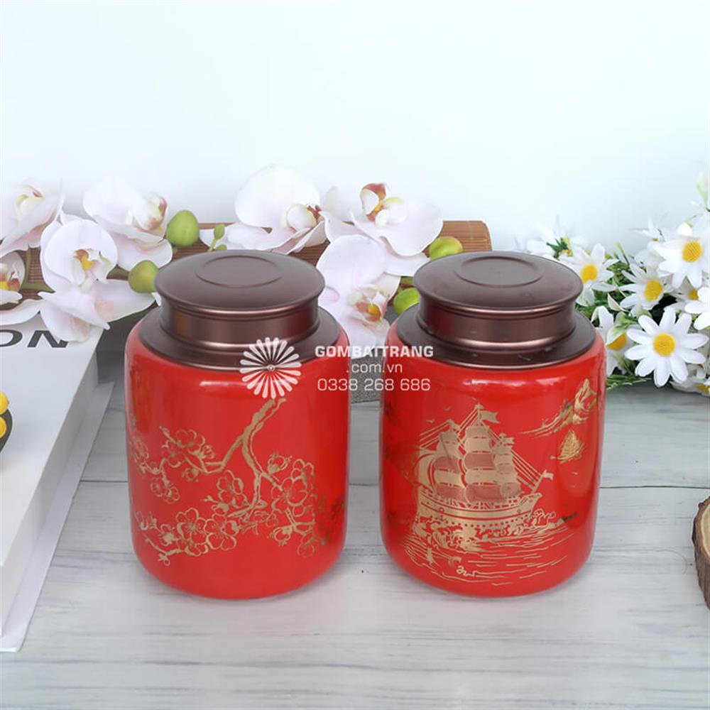 Hộp đựng chè khô gốm sứ từ trước tới nay luôn được xem là món quà ý nghĩa, thể hiện sự trân trọng của người tặng. Bộ đôi hộp đựng chè khô màu đỏ rực rỡ với họa tiết hoa đào và thuyền buồm vàng kim đang trở thành lựa chọn hàng đầu cho những dịp lễ tết, khai trương hay tri ân đối tác, khách hàng.