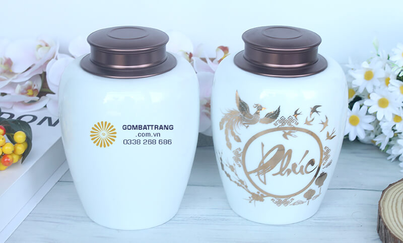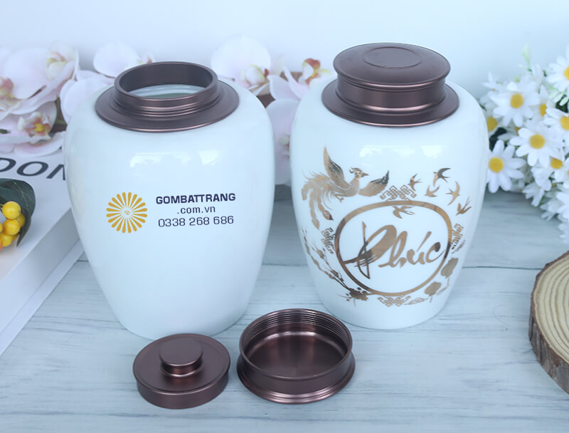 Điểm nhấn đặc biệt của lọ đựng chè đẹp chính là hoa văn trang trí tinh xảo được mạ vàng 24k. Hình ảnh chim phượng hoàng bay lượn, kết hợp với những họa tiết truyền thống Việt Nam tạo nên một tác phẩm nghệ thuật đích thực. Chữ "Lộc" và chữ "Phúc" được viết bằng thư pháp đẹp mắt, nằm trong vòng tròn ở trung tâm thân lọ, thể hiện ý nghĩa phong thủy sâu sắc mang lại may mắn và thịnh vượng cho gia chủ.hộp đựng trà bằng gốm