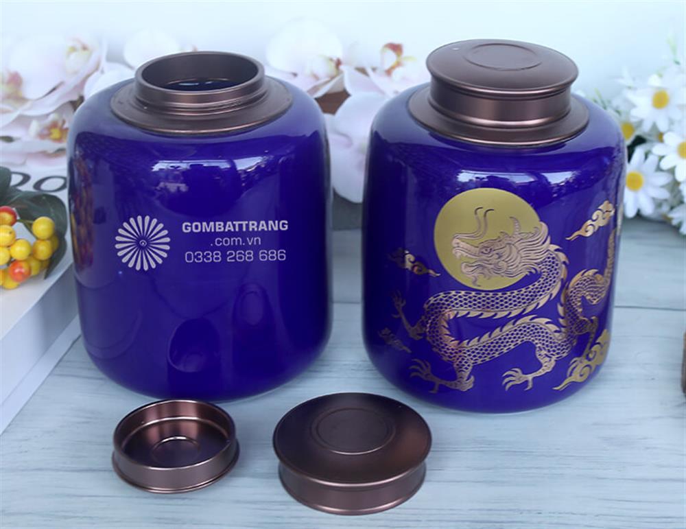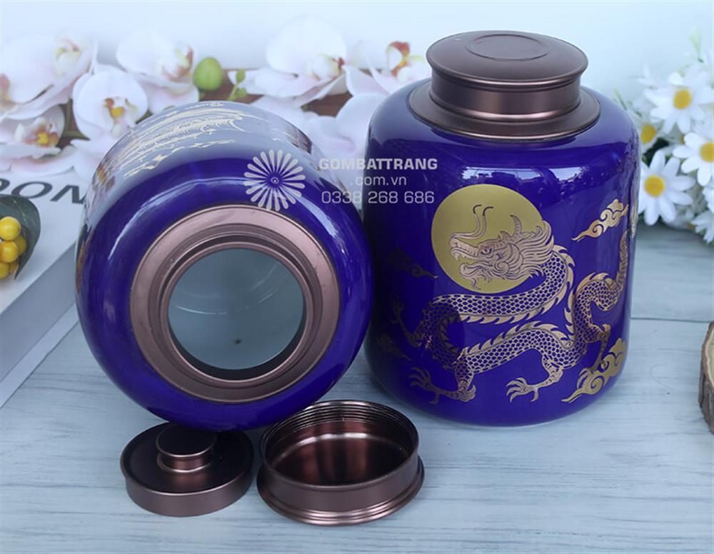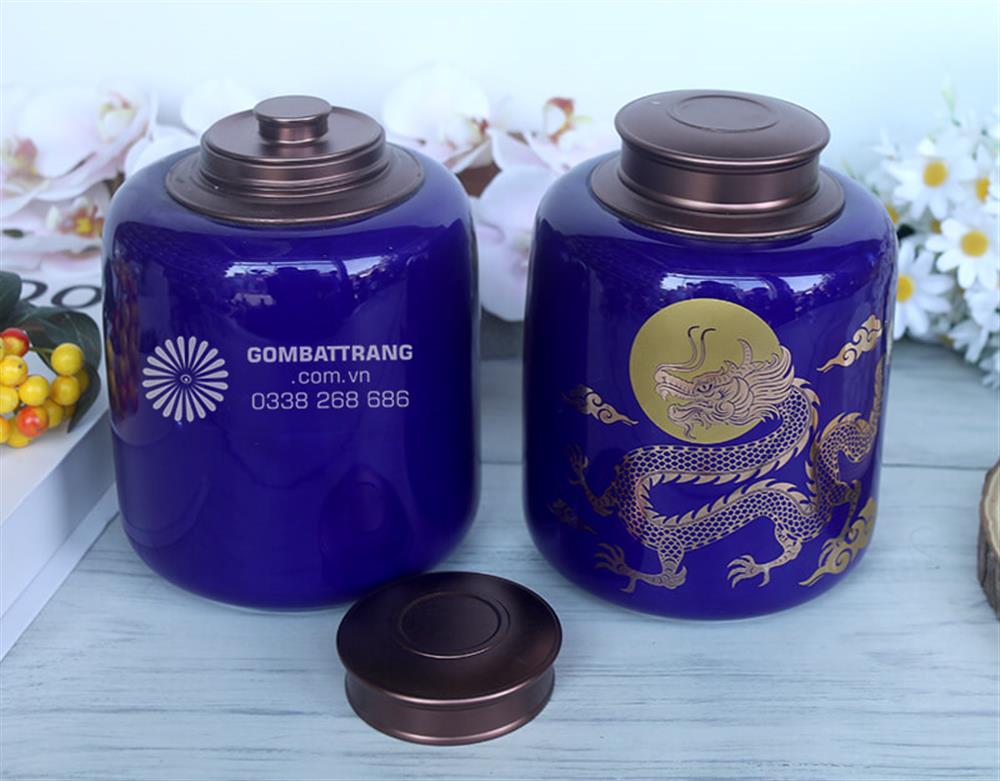 Lọ đựng chè đẹp khắc họa hình ảnh con rồng uốn lượn uy nghiêm, được mạ vàng 24K sang trọng. Trong văn hóa Á Đông, rồng là biểu tượng của quyền lực, sự cao quý và thịnh vượng tột đỉnh. Hũ đựng trà bằng sứ với họa tiết rồng vàng không chỉ mang lại năng lượng tích cực cho gia chủ mà còn thu hút tài lộc, vượng khí vào nhà.hộp đựng trà bằng gốm
