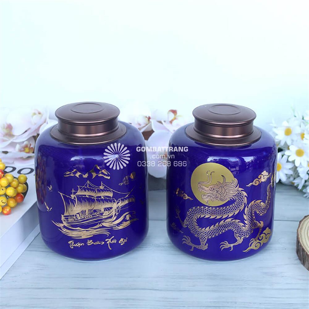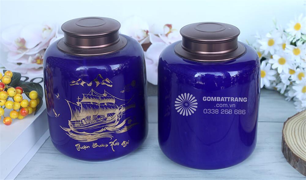 Lọ đựng chè đẹp mạ vàng hình ảnh "Thuận Buồm Xuôi Gió" mang ý nghĩa phong thủy sâu sắc về sự thuận lợi trong công việc, may mắn trong cuộc sống và thành công vượt qua mọi thử thách. Hộp đựng trà bằng gốm thích hợp làm quà tặng cho doanh nhân hay những ai đang tìm kiếm sự đột phá trong sự nghiệp.hộp đựng trà bằng gốm