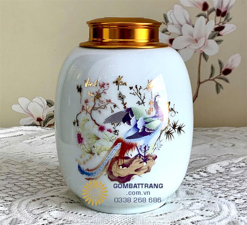 Ngoài chức năng bảo quản, chiếc bình đựng trà khô này còn là vật phẩm trang trí bàn trà vô cùng ấn tượng. Khi đặt trên bàn trà hoặc trong tủ trưng bày, lọ đựng chè đẹp với sắc trắng thanh nhã, họa tiết nhiều màu sắc và điểm nhấn vàng kim sẽ ngay lập tức trở thành tâm điểm thu hút ánh nhìn.hộp đựng trà cao cấp