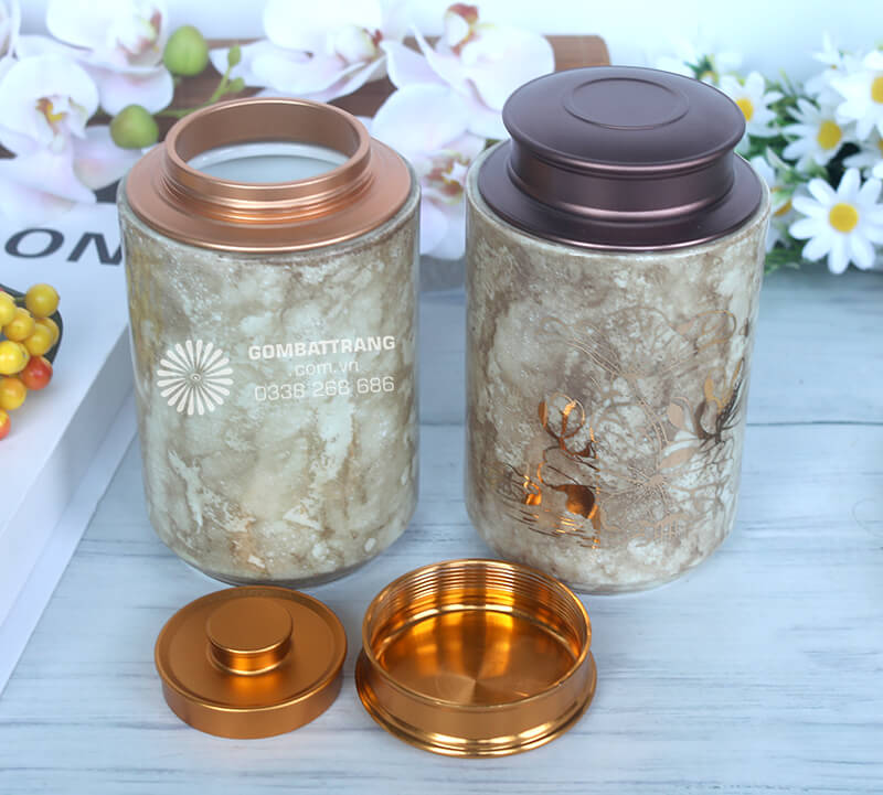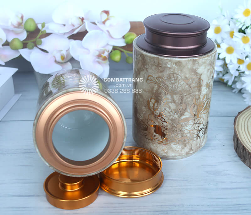 Điểm nhấn quan trọng của hộp đựng trà cao cấp chính là phần nắp đậy được làm từ kim loại cao cấp có độ chắc chắn khi đóng nắp. Phần viền nắp ôm khít thân hũ đựng chè, đảm bảo khả năng bảo quản trà tối ưu, tránh ẩm mốc và giữ trọn hương vị.hộp đựng trà cao cấp