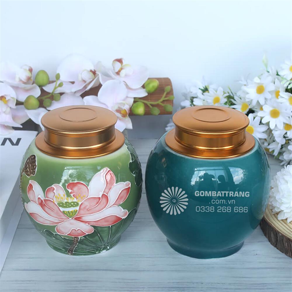 Hũ đựng trà có chất liệu bát tràng cao cấp, thiết kế màu sắc hài hòa và họa tiết phong thủy ý nghĩa
