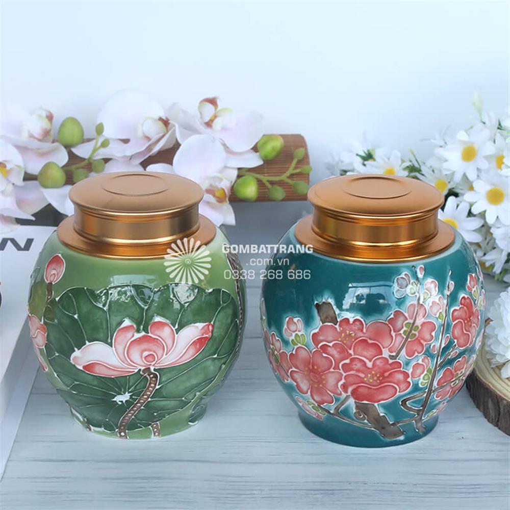 Lọ đựng trà gốm sứ với họa tiết hoa sen và hoa đào nổi bật là sản phẩm mang đến sự kết hợp hoàn hảo giữa nghệ thuật truyền thống và công năng hiện đại. Hai chiếc hũ đựng trà bằng gốm này không chỉ là vật dụng lưu giữ hương vị trà nguyên bản mà còn là món đồ trang trí tinh xảo, tô điểm cho không gian sống thêm phần sang trọng và ý nghĩa.Hộp Đựng Trà Đẹp