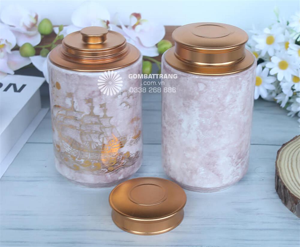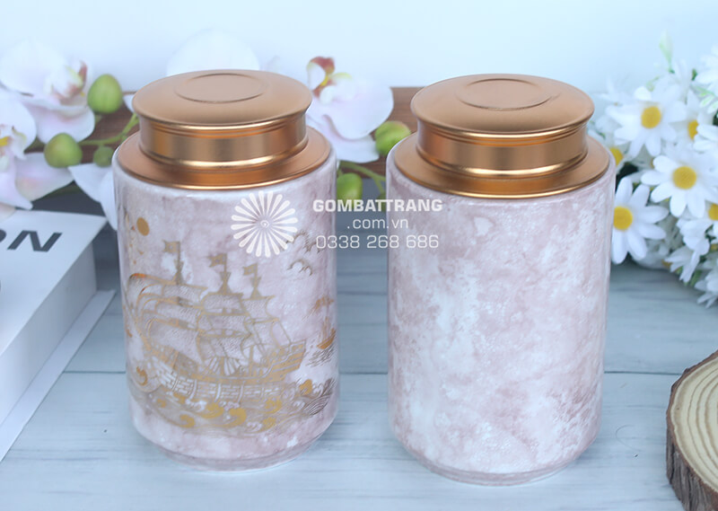 Kích thước cân đối nên khi đặt lọ chè trên bàn khách, tủ trưng bày đều không lo chiếm diện tích. Sự kết hợp giữa sắc hồng nhẹ nhàng và họa tiết vàng lấp lánh tạo điểm nhấn tinh tế, thu hút mọi ánh nhìn mà vẫn giữ được sự hài hòa với tổng thể không gian.hộp đựng trà
