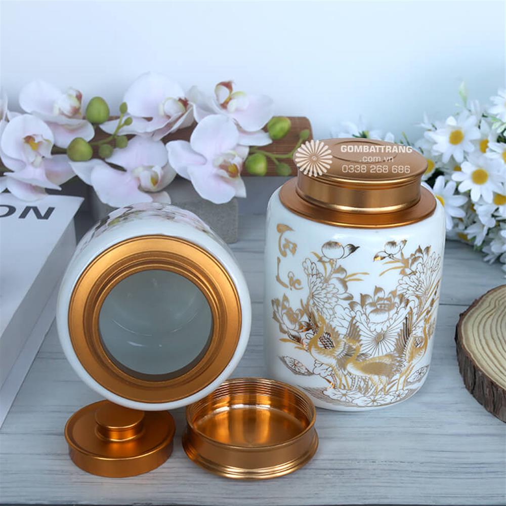 Đặt trên bàn trà phòng khách, kệ tủ phòng làm việc, lọ đựng trà tạo nên điểm nhấn nghệ thuật đầy cuốn hút. Màu trắng ngà kết hợp với vàng đồng dễ dàng hòa hợp với nhiều phong cách nội thất từ cổ điển, tân cổ điển đến hiện đại tối giản. Khi ánh sáng chiếu vào, các họa tiết vàng kim lấp lánh tạo hiệu ứng bắt mắt, khiến không gian thêm ấm cúng và sang trọng.hộp trà gốm