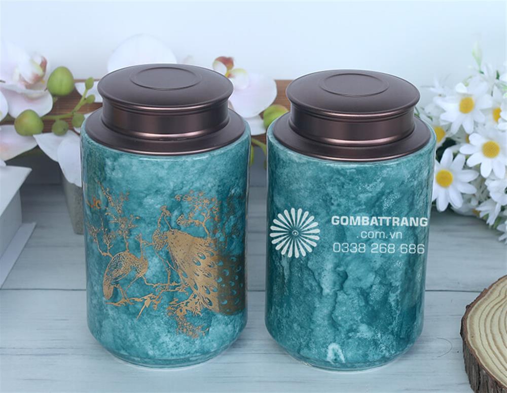 Hộp trà gốm được trang trí họa tiết chim công mạ vàng sang trọng lộng lẫy