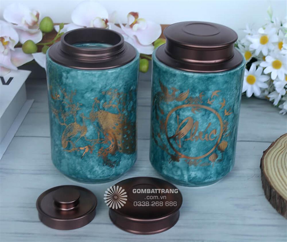 Sắc xanh ngọc bích kết hợp với ánh vàng kim quý phái tạo nên tổng thể hài hòa, dễ dàng phối hợp với nhiều phong cách nội thất khác nhau từ cổ điển đến hiện đại. Khi đặt cạnh nhau trên bàn trà, hai chiếc hũ đựng trà bát tràng với họa tiết Công và Phúc tạo thành một cặp đôi hoàn hảo, vừa có ý nghĩa phong thủy "Công Phúc song toàn" vừa mang lại cảm giác thẩm mỹ cao.hộp trà gốm