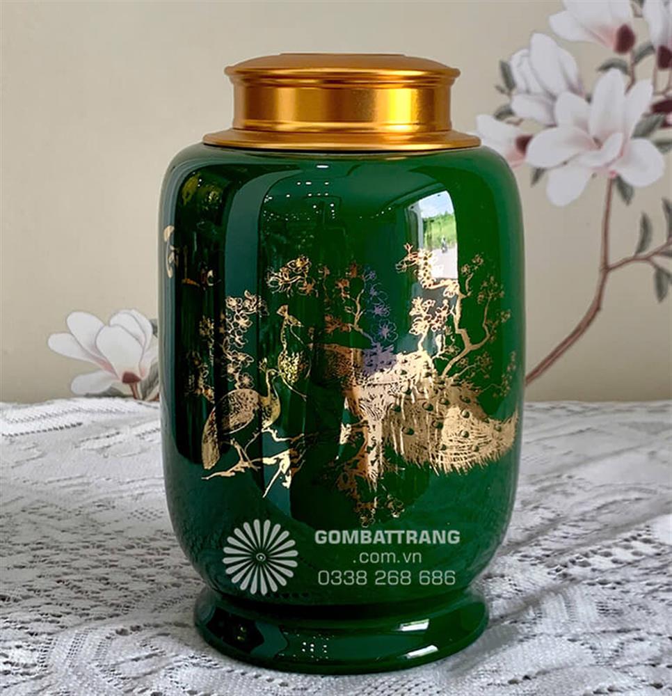 Bộ sưu tập hũ đựng trà bằng sứ Tài Lộc được trình làng với 3 phiên bản màu sắc tinh tế: xanh ngọc lục bảo, xanh ngọc bích đậm và đỏ sang trọng. Mỗi hũ đựng trà đẹp là một tác phẩm nghệ thuật gốm sứ Bát Tràng với men bóng loáng, phản chiếu ánh sáng tuyệt đẹp. Nắp đậy mạ vàng kim loại tạo điểm nhấn đẳng cấp, vừa chắc chắn vừa dễ dàng mở đóng.Hũ đựng trà bằng sứ