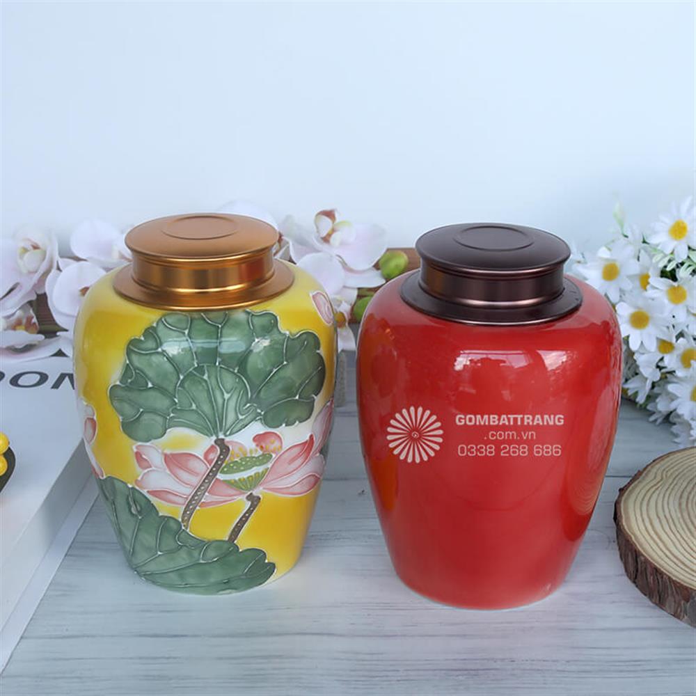 Lọ đựng trà gốm sứ với sắc đỏ và vàng kết hợp hài hòa không chỉ mang ý nghĩa may mắn mà còn tạo điểm nhấn sang trọng cho góc trà đạo. Đây cũng là món quà ý nghĩa trong các dịp lễ Tết, tân gia hay mừng năm mới.hũ đựng trà