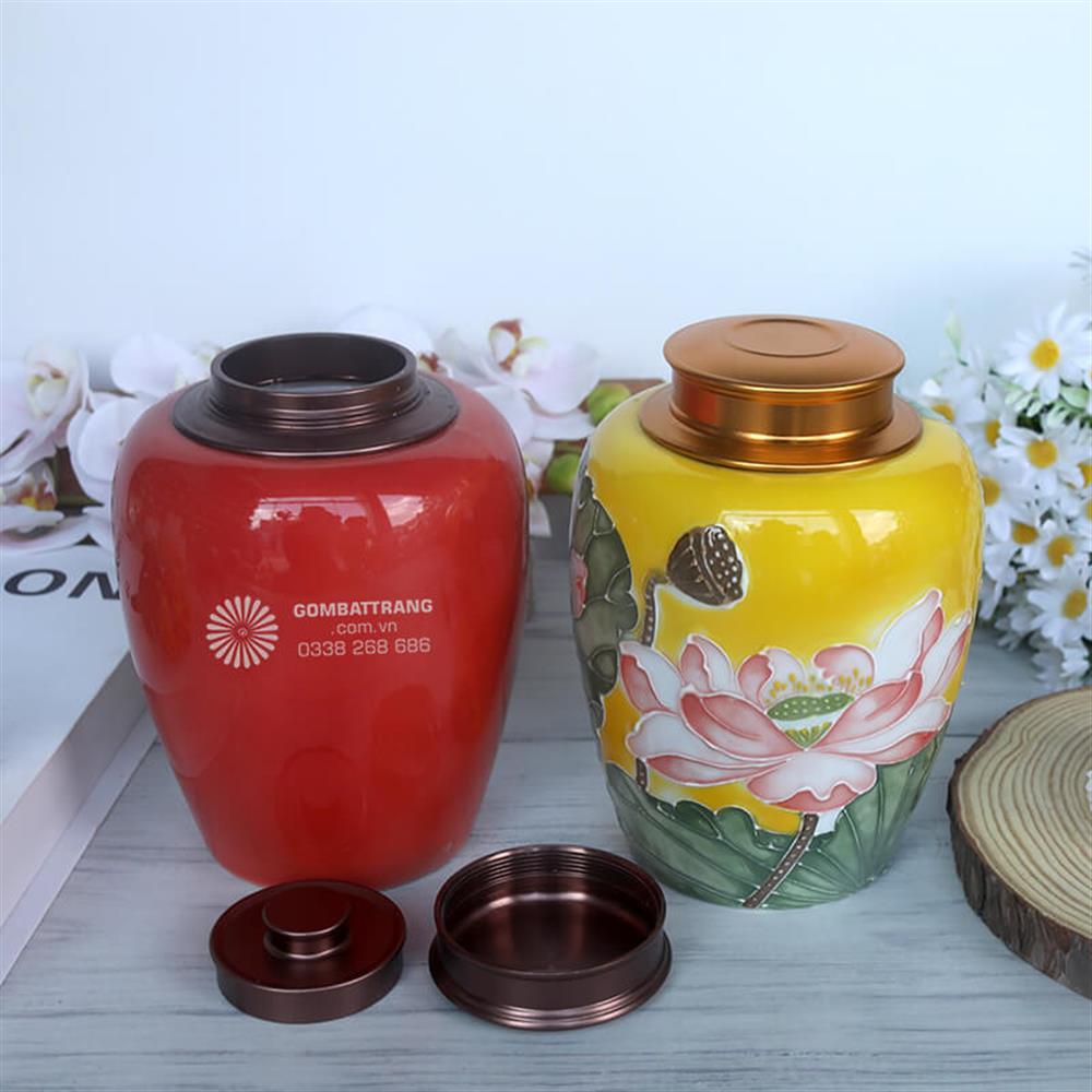 Mẫu hũ sứ đựng trà nền vàng được điểm tô bằng hình ảnh hoa sen mềm mại, tinh khôi. Hoa sen vốn là biểu tượng của sự thanh cao, thuần khiết và giác ngộ. Việc đặt hũ đựng trà bằng gốm họa tiết hoa sen trên bàn trà giúp không gian trở nên hài hòa, tạo cảm giác bình an, thư thái cho gia chủ mỗi khi thưởng trà.hũ đựng trà