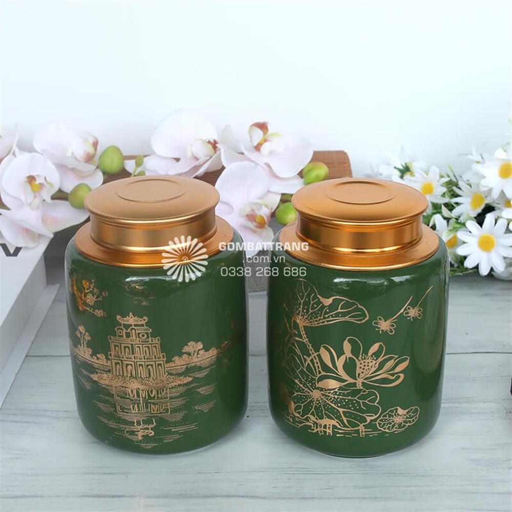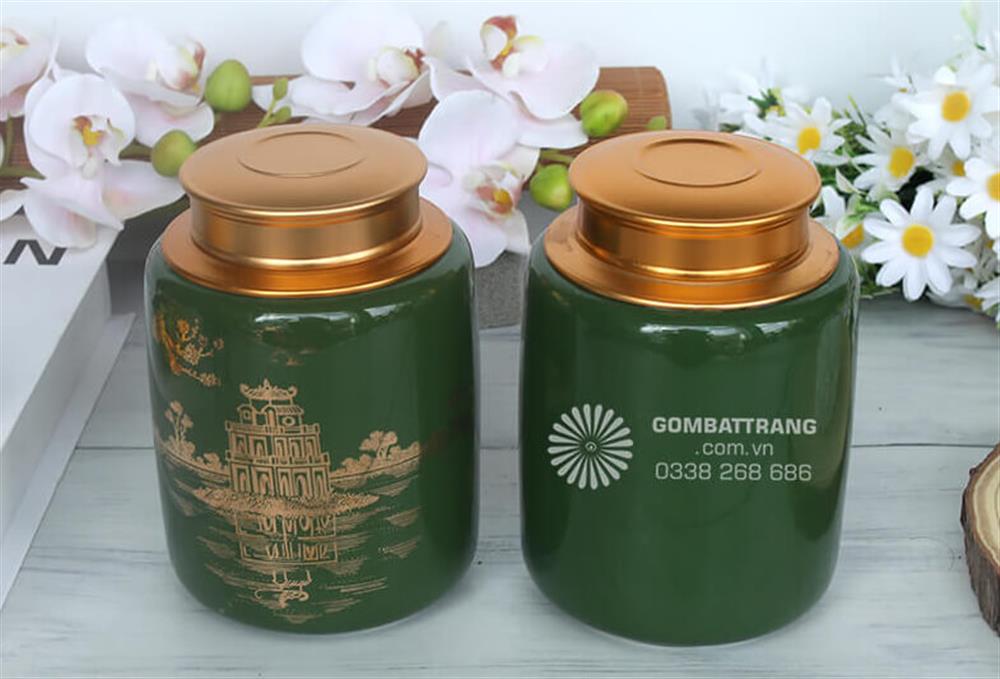 Sắc xanh lục bảo sang trọng và họa tiết văn hóa đậm chất Việt khiến lọ đựng trà gốm sứ thành điểm nhấn tuyệt vời cho bàn trà, kệ tủ trưng bày hay phòng khách. Mỗi lần nhìn thấy hộp đựng trà bằng gốm này, thúng ta lại cảm nhận được nét đẹp truyền thống và niềm tự hào về văn hóa dân tộc. Bộ đôi lọ đựng trà gốm sứ Bát Tràng với sắc xanh lục bảo quý phái, nắp đồng vàng óng ánh và họa tiết Tháp Rùa - Hoa Sen chạm khắc tinh xảo chính là sự kết hợp hoàn hảo giữa công năng và thẩm mỹ.Lọ đựng trà