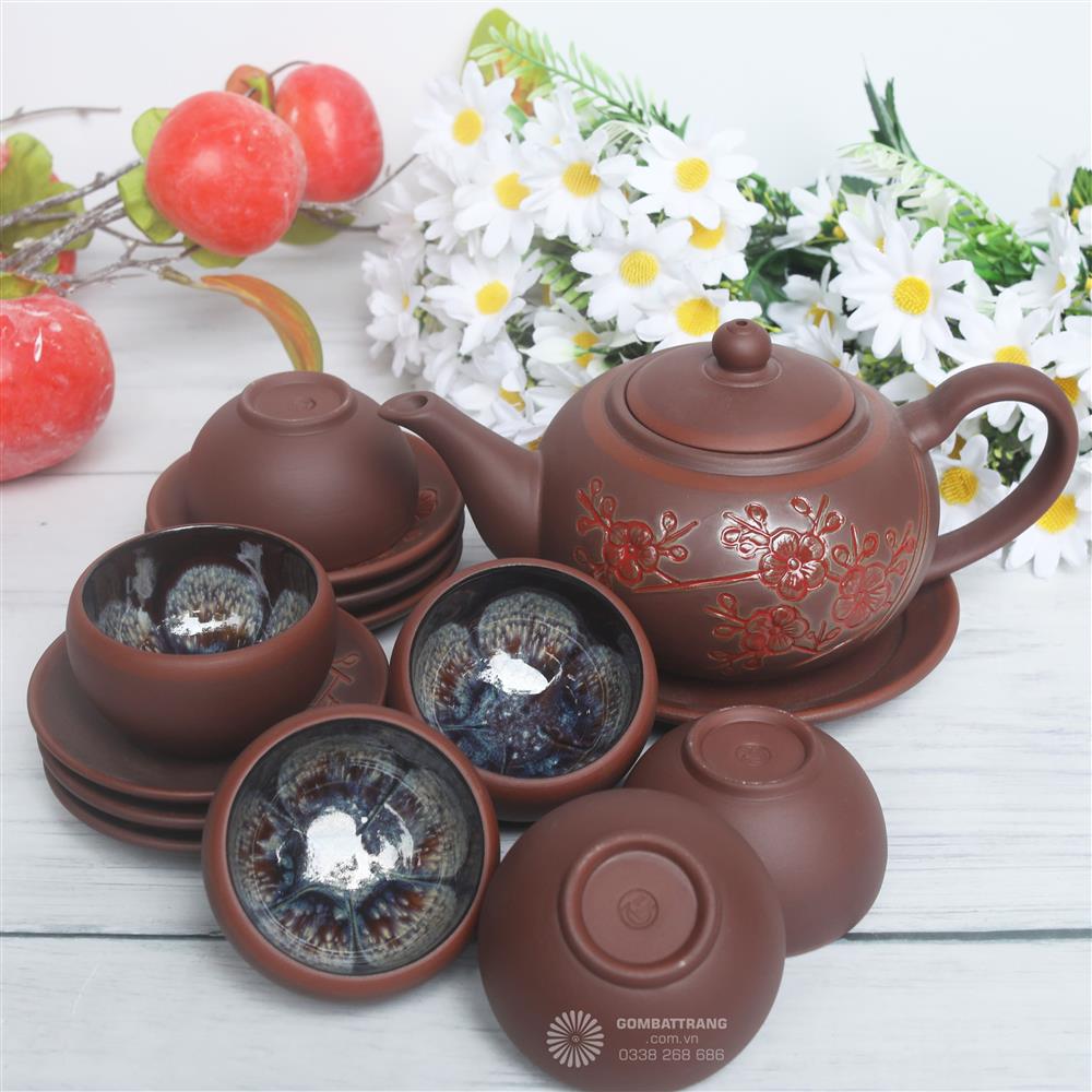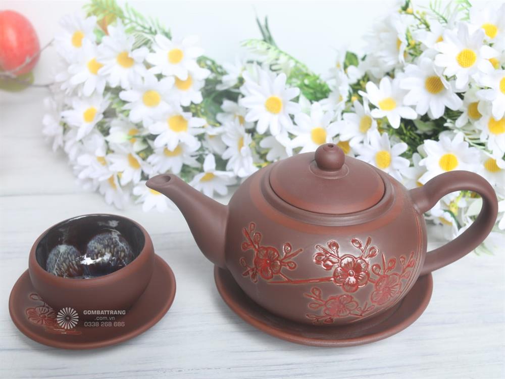 Mua trọn bộ ấm trà tử sa khắc hoa đào chính hãng Bát Tràng loại cao cấp