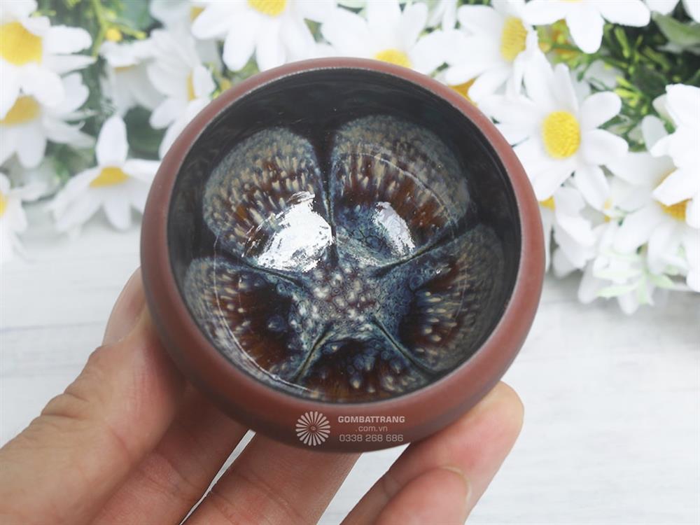 Đây là chiếc chén tử sa men lam đặc biệt. Trong chén uống trà cao cấp được tráng loại men lam cao cấp với những đường vân huyền bí, hút mắt. Mỗi đường vân có độ lan tỏa tự nhiên tựa như những cánh hoa đang bung xòe, đua nhau khoe sắc.