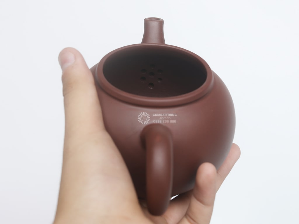 Phía bên trong ấm trà, nút giao giữa thân ấm và vòi là lỗ lọc trà thông thoáng, đều đẹp. Lỗ lọc trà được chạm trổ tỉ mỉ giúp trà ra đều mà vẫn lọc được bã. Từ đó giúp vòi rót thêm trơn tru, trài nghiệm trà đạo được vẹn tròn, thoải mái.