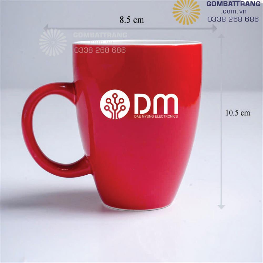 Ly sứ quai tròn, đáy thót, miệng hơi loe, men đỏ đô bên trong men trắng tinh, thiết kế trẻ trung thanh lịch, in logo theo yêu cầu