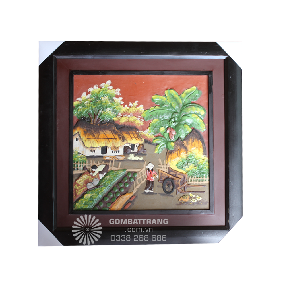 Bức Tranh gốm Bát Tràng tái hiện cảnh làng quê Việt Nam giản dị với mái nhà tranh, vườn rau xanh mướt, hàng cau và bụi chuối quen thuộc. Người nông dân hiện lên mộc mạc, gắn bó với lao động thường nhật, mang đến cảm giác gần gũi, thân thuộc. Từng chi tiết đều được chế tác thủ công, thể hiện rõ nét sự tinh tế và tài hoa của nghệ nhân gốm.tranh gốm bát tràng