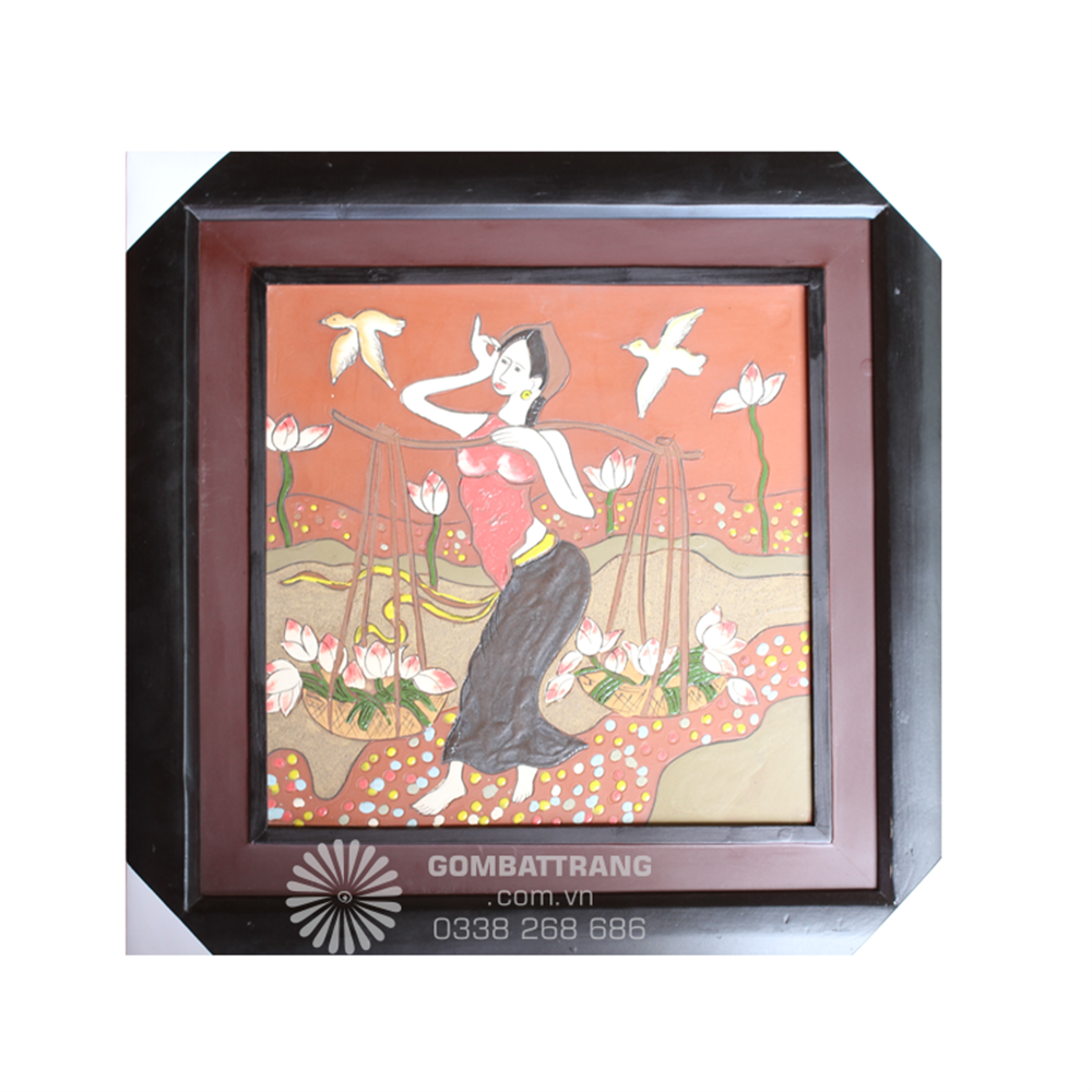 Tác phẩm tranh gốm bát tràng treo tường thiếu nữ gánh sen độc đáo